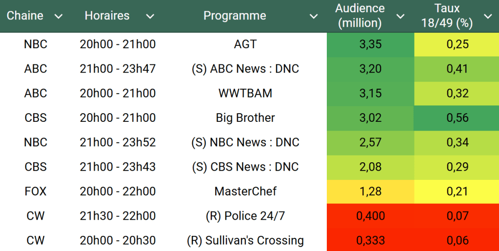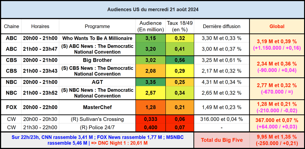 Audiences US du Mercredi 21.08.24 : AGT leader au plus bas. ABC encore en hausse avec la suite de la convention démocrate. MasterChef faible. Thomas Fusil Communiqués Audiences US 24 août 2024 1 Minute Voici les audiences de la soirée du 21 Aout Audiences triées (téléspectateurs) Partager : Partager sur X(ouvre dans une nouvelle fenêtre) X Partager sur Facebook(ouvre dans une nouvelle fenêtre) Facebook J’aime chargement… Similaire Publié par Thomas Fusil Voir tous les articles par Thomas Fusil Publié 24 août 2024