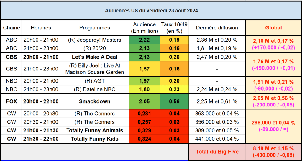 Audiences US du Vendredi 23.08.24 : Jeopardy Masters domine de peu sur ABC. 20/20 remonte. FOX large leader sur cible. Thomas Fusil Communiqués Audiences US 27 août 2024 1 Minute Voici les audiences de la soirée du 23 Aout Audiences triées (téléspectateurs) Partager : Partager sur X(ouvre dans une nouvelle fenêtre) X Partager sur Facebook(ouvre dans une nouvelle fenêtre) Facebook J’aime chargement… Similaire Publié par Thomas Fusil Voir tous les articles par Thomas Fusil Publié 27 août 2024