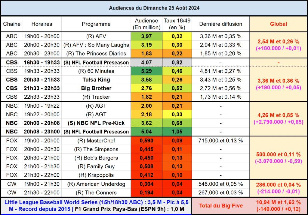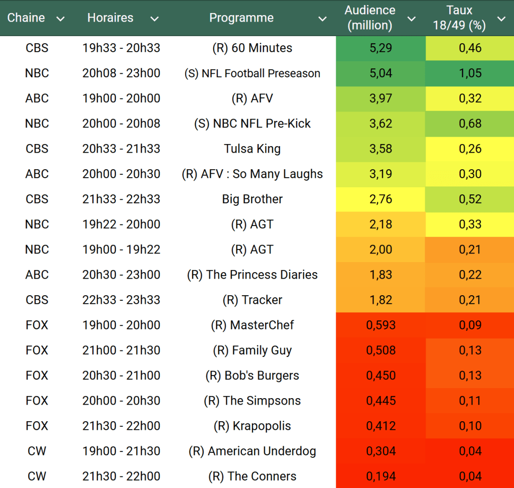 Audiences US du Dimanche 25.08.24 : 60 Minutes sur CBS et la NFL sur NBC au dessus des 5 millions. AFV en hausse. FOX et CW faibles. Thomas Fusil Communiqués Audiences US 28 août 2024 1 Minute Voici les audiences de la soirée du 25 Aout Audiences triées (téléspectateurs) Partager : Partager sur X(ouvre dans une nouvelle fenêtre) X Partager sur Facebook(ouvre dans une nouvelle fenêtre) Facebook J’aime chargement… Similaire Publié par Thomas Fusil Voir tous les articles par Thomas Fusil Publié 28 août 2024