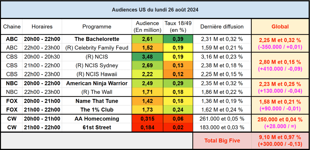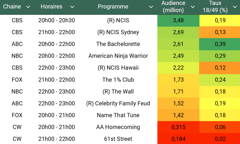 Audiences US du Lundi 26.08.24 : NCIS bon leader en rediffusion sur CBS. The Bachelorette remonte et se place devant American Ninja Warrior. Thomas Fusil Communiqués Audiences US 28 août 2024 1 Minute Voici les audiences de la soirée du 26 Aout Audiences triées (téléspectateurs) Partager : Partager sur X(ouvre dans une nouvelle fenêtre) X Partager sur Facebook(ouvre dans une nouvelle fenêtre) Facebook J’aime chargement… Similaire Publié par Thomas Fusil Voir tous les articles par Thomas Fusil Publié 28 août 2024