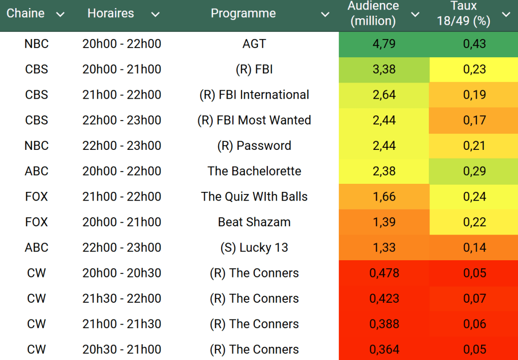 Audiences US du Mardi 27.08.24 : AGT large leader en hausse sur NBC. La rediffusion de FBI progresse nettement. Lucky 13 très faible sur ABC. Thomas Fusil Communiqués Audiences US 29 août 2024 1 Minute Voici les audiences de la soirée du 27 Aout Audiences triées (téléspectateurs) Partager : Partager sur X(ouvre dans une nouvelle fenêtre) X Partager sur Facebook(ouvre dans une nouvelle fenêtre) Facebook J’aime chargement… Similaire Publié par Thomas Fusil Voir tous les articles par Thomas Fusil Publié 29 août 2024