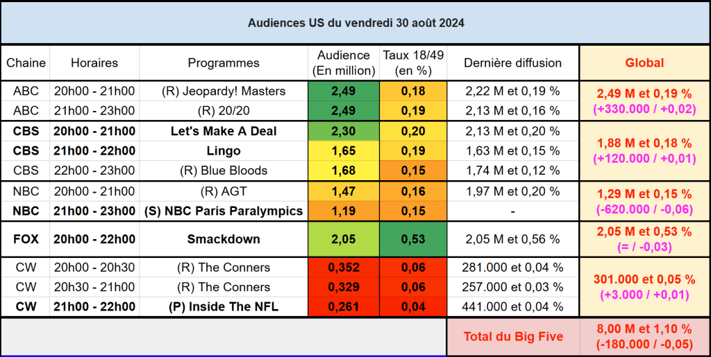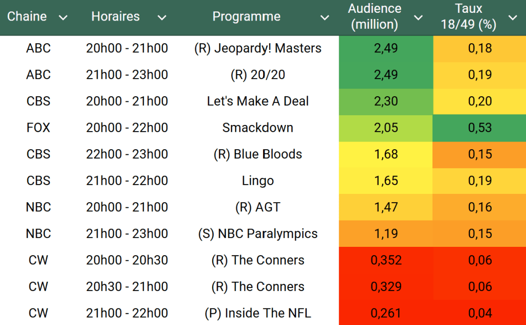 Audiences US du Vendredi 30.08.24 : ABC domine avec Jeopardy Masters et 20/20. Let’s Make A Deal remonte. Petit score pour les jeux paralympiques sur NBC. Thomas Fusil Communiqués Audiences US 4 septembre 2024 1 Minute Voici les audiences de la soirée du 30 Aout Audiences triées (téléspectateurs) Partager : Partager sur X(ouvre dans une nouvelle fenêtre) X Partager sur Facebook(ouvre dans une nouvelle fenêtre) Facebook J’aime chargement… Similaire Publié par Thomas Fusil Voir tous les articles par Thomas Fusil Publié 4 septembre 2024