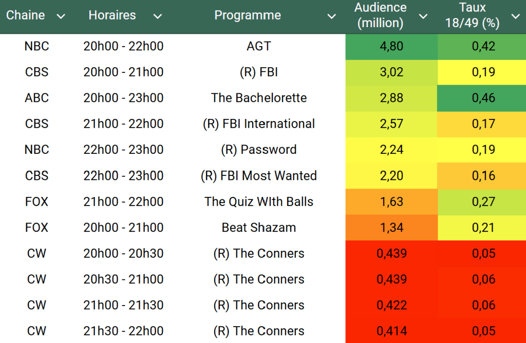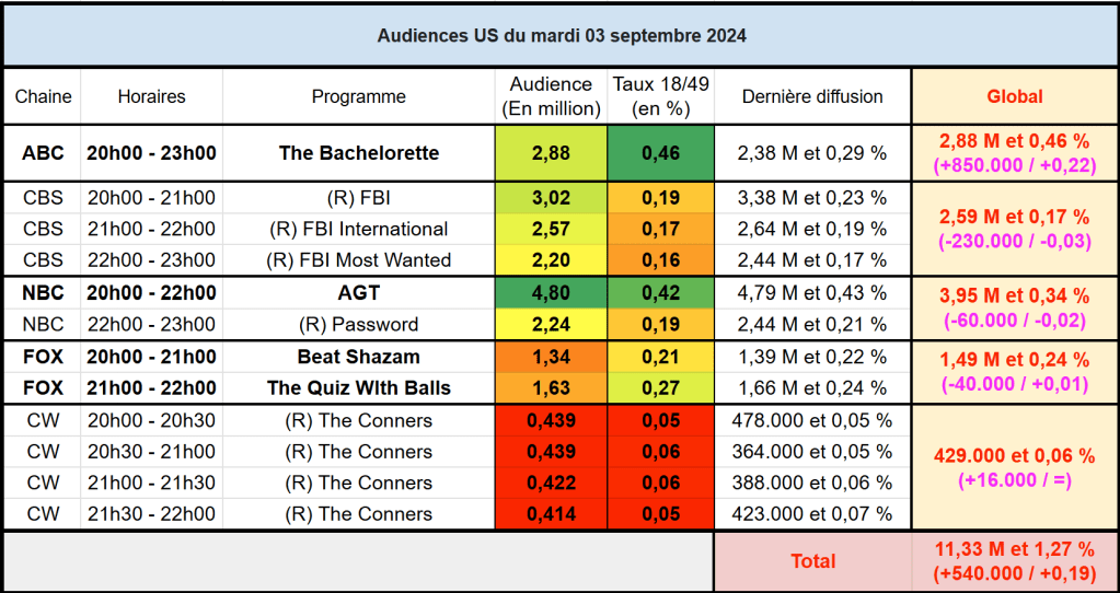 Audiences US du Mardi 03.09.24 : AGT stable sur NBC. The Bachelorette termine en hausse et permet à ABC d’être leader sur cible et de doubler CBS. Thomas Fusil Communiqués Audiences US 8 septembre 2024 1 Minute Voici les audiences de la soirée du 3 Septembre Audiences triées (téléspectateurs) Partager : Partager sur X(ouvre dans une nouvelle fenêtre) X Partager sur Facebook(ouvre dans une nouvelle fenêtre) Facebook J’aime chargement… Similaire Publié par Thomas Fusil Voir tous les articles par Thomas Fusil Publié 8 septembre 2024