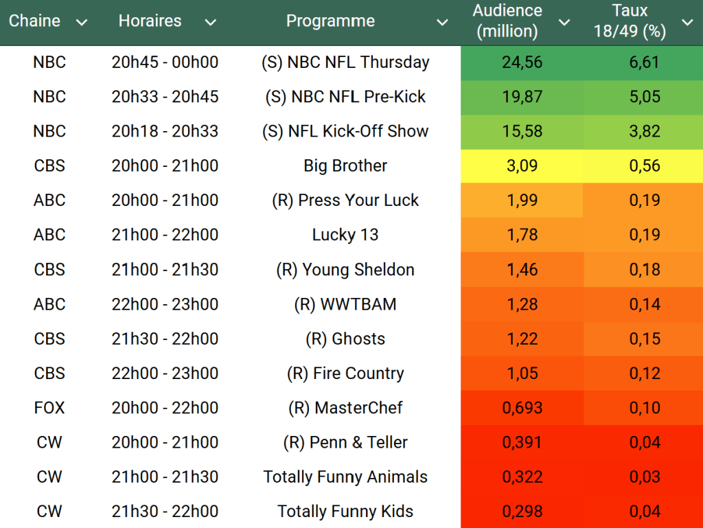 Audiences US du Jeudi 05.09.24 : NBC écrase la concurrence avec le retour de la NFL qui dépasse les 24 millions. Big Brother s’en sort bien sur CBS. Thomas Fusil Communiqués Audiences US 11 septembre 2024 1 Minute Voici les audiences de la soirée du 5 Septembre Audiences triées (téléspectateurs) Partager : Partager sur X(ouvre dans une nouvelle fenêtre) X Partager sur Facebook(ouvre dans une nouvelle fenêtre) Facebook J’aime chargement… Similaire Publié par Thomas Fusil Voir tous les articles par Thomas Fusil Publié 11 septembre 2024