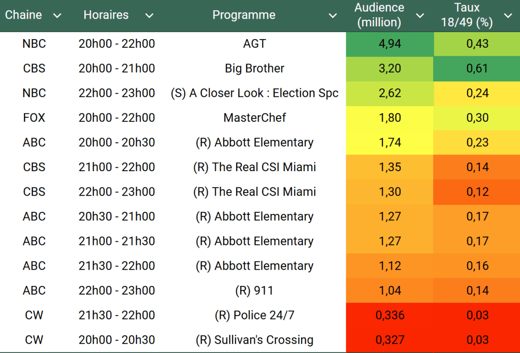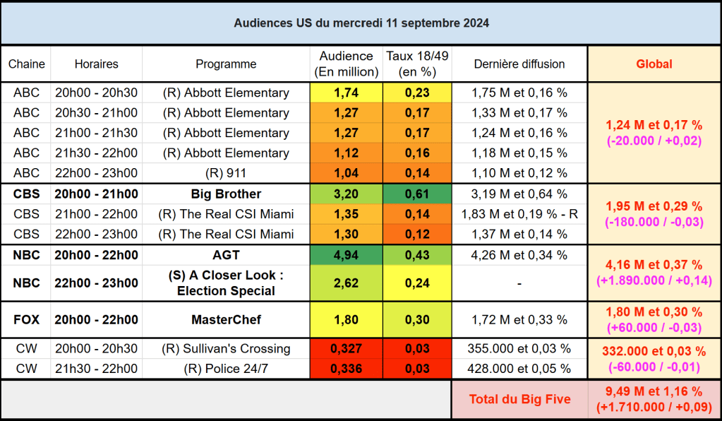 Audiences US du Mercredi 11.09.24 : AGT et Big Brother dominent largement en téléspectateurs pour l’un et sur cible pour l’autre. ABC faible. MasterChef en hausse. Thomas Fusil Communiqués Audiences US 13 septembre 2024 1 Minute Voici les audiences de la soirée du 11 Septembre Audiences triées (téléspectateurs) Partager : Partager sur X(ouvre dans une nouvelle fenêtre) X Partager sur Facebook(ouvre dans une nouvelle fenêtre) Facebook J’aime chargement… Similaire Publié par Thomas Fusil Voir tous les articles par Thomas Fusil Publié 13 septembre 2024