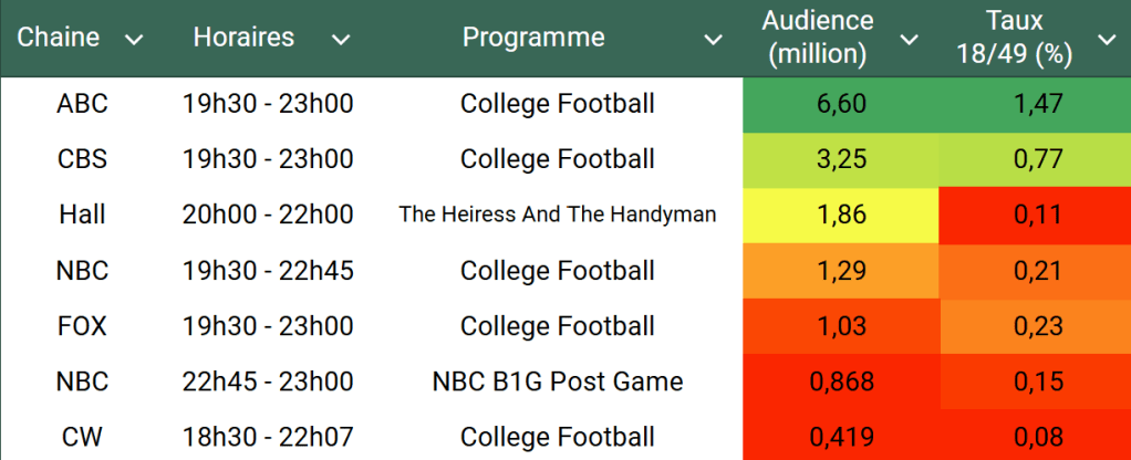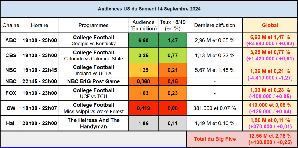 Audiences US du Samedi 14.09.24 : College Football au top sur ABC. CBS en belle forme. Excellent score pour Hallmark. NBC et FOX faibles. Thomas Fusil Communiqués Audiences US 18 septembre 2024 1 Minute Voici les audiences de la soirée du 14 Septembre Audiences triées (téléspectateurs) Partager : Partager sur X(ouvre dans une nouvelle fenêtre) X Partager sur Facebook(ouvre dans une nouvelle fenêtre) Facebook J’aime chargement… Similaire Publié par Thomas Fusil Voir tous les articles par Thomas Fusil Publié 18 septembre 2024