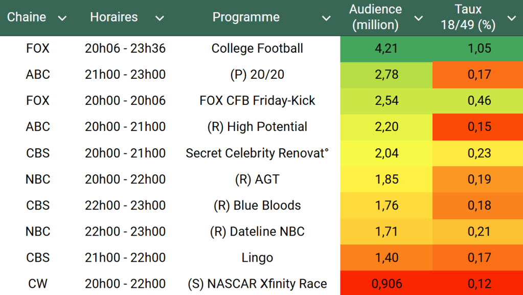 Audiences US du Vendredi 20.09.24 : FOX net leader avec College Football. 20/20 en hausse. Bon score pour la rediff de High Potential. CBS faible. CW en grande forme. Thomas Fusil Communiqués Audiences US 27 septembre 2024 1 Minute Voici les audiences de la soirée du 20 Septembre Audiences triées (téléspectateurs) Partager : Partager sur X(ouvre dans une nouvelle fenêtre) X Partager sur Facebook(ouvre dans une nouvelle fenêtre) Facebook J’aime chargement… Similaire Publié par Thomas Fusil Voir tous les articles par Thomas Fusil Publié 27 septembre 2024