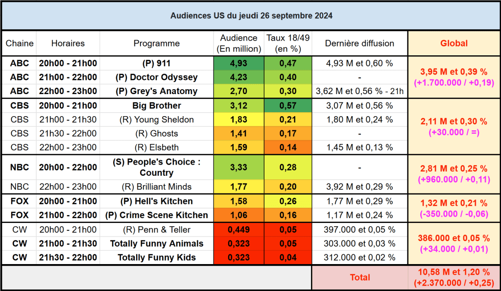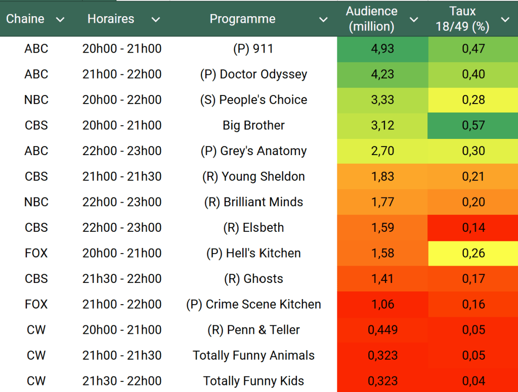 Audiences US du Jeudi 26.09.24 : Le duo 911 & Doctor Odyseey au top sur ABC. Grey’s Anatomy en baisse dans sa nouvelle case. Joli score pour NBC. FOX souffre un peu. Thomas Fusil Communiqués Audiences US 28 septembre 2024 1 Minute Voici les audiences de la soirée du 26 Septembre Audiences triés (téléspectateurs) Partager : Partager sur X(ouvre dans une nouvelle fenêtre) X Partager sur Facebook(ouvre dans une nouvelle fenêtre) Facebook J’aime chargement… Similaire Publié par Thomas Fusil Voir tous les articles par Thomas Fusil Publié 28 septembre 2024