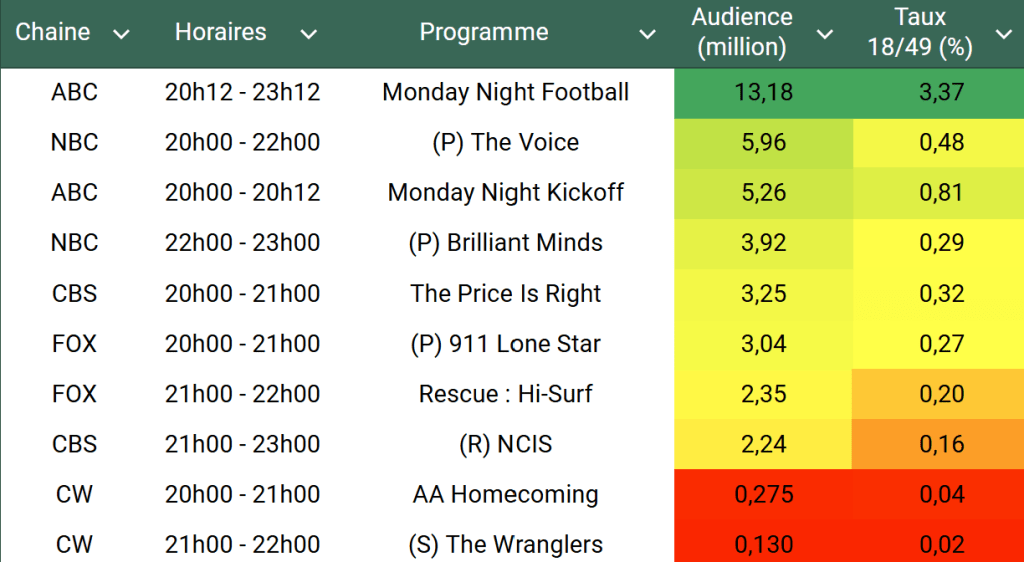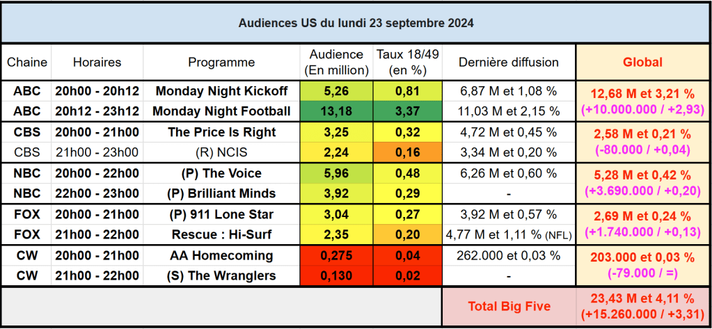 Audiences US du Lundi 23.09.24 : La NFL large leader. Lancement réussi pour Brilliant Minds. Soirée solide pour FOX avec 911 Lone Star et Rescue HI-Surf malgré des baisses.