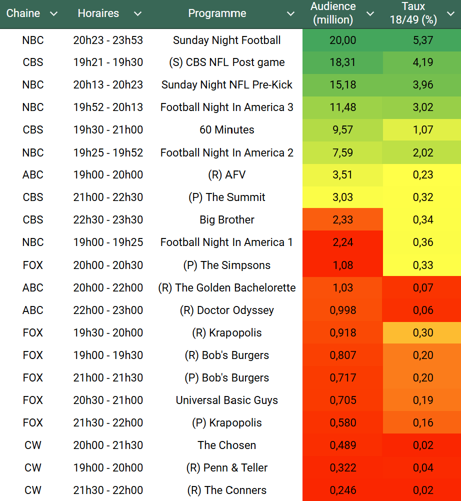 Audiences US du Dimanche 29.09.24 : SNF puissant leader. 60 Minutes au dessus des 9 millions. Lancement décevant pour The Summit. ABC en souffrance. Thomas Fusil Communiqués Audiences US 5 octobre 2024 1 Minute Voici les audiences de la soirée du 29 Septembre Audiences triées (téléspectateurs) Partager : Partager sur X(ouvre dans une nouvelle fenêtre) X Partager sur Facebook(ouvre dans une nouvelle fenêtre) Facebook J’aime chargement… Similaire Publié par Thomas Fusil Voir tous les articles par Thomas Fusil Publié 5 octobre 2024