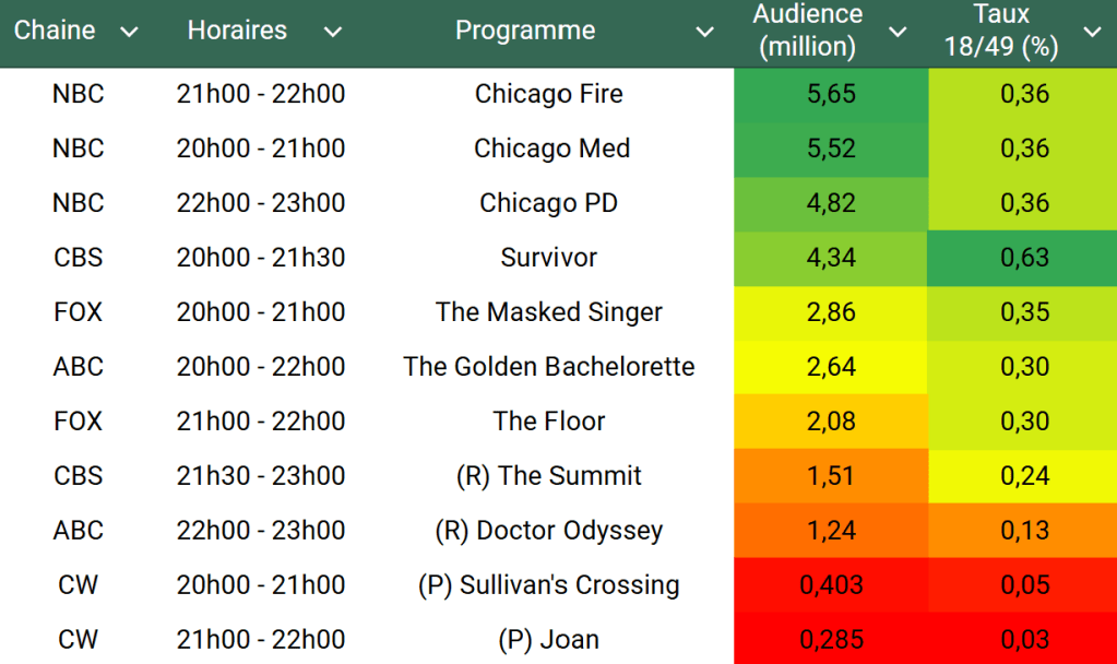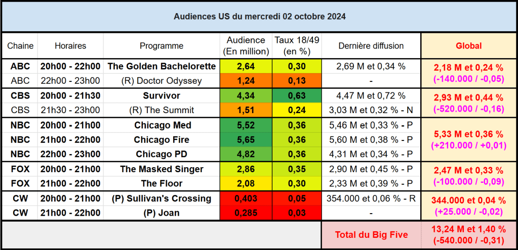Audiences US du Mercredi 02.10.24 : Le One Chicago large leader en hausse sur NBC. Survivor, The Masked Singer et The Floor en baisse. Thomas Fusil Communiqués Audiences US 7 octobre 2024 1 Minute Voici les audiences de la soirée du 2 Octobre Audiences triées (téléspectateurs) Partager : Partager sur X(ouvre dans une nouvelle fenêtre) X Partager sur Facebook(ouvre dans une nouvelle fenêtre) Facebook J’aime chargement… Similaire Publié par Thomas Fusil Voir tous les articles par Thomas Fusil Publié 7 octobre 2024