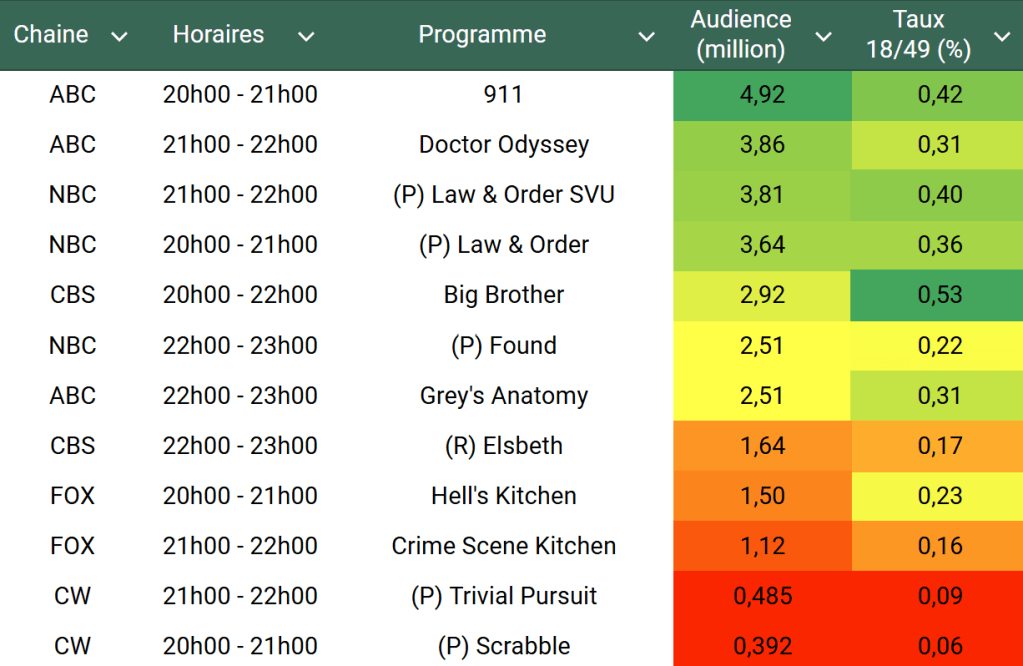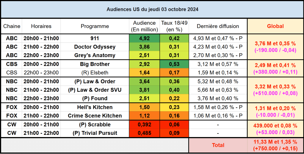 Audiences US du Jeudi 03.10.24 : 911 très bon leader sur ABC. Doctor Odyssey en baisse, mais solide. Enorme chute pour le retour de Law & Oder et Law & Order SVU sur NBC. Thomas Fusil Communiqués Audiences US 8 octobre 2024 1 Minute Voici les audiences de la soirée du 3 Octobre Audiences triées (téléspectateurs) Partager : Partager sur X(ouvre dans une nouvelle fenêtre) X Partager sur Facebook(ouvre dans une nouvelle fenêtre) Facebook J’aime chargement… Similaire Publié par Thomas Fusil Voir tous les articles par Thomas Fusil Publié 8 octobre 2024