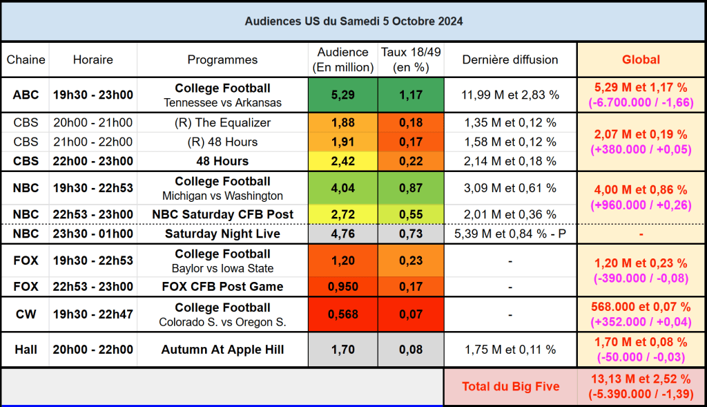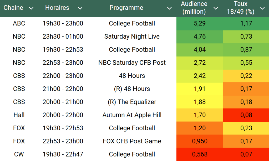 Audiences US du Samedi 05.10.24 : ABC toujours en tête avec College Football. NBC en grande forme. 48 Hours en hausse. FOX faible. Thomas Fusil Communiqués Audiences US 11 octobre 202411 octobre 2024 1 Minute Voici les audiences de la soirée du 5 Octobre Audiences triées (téléspectateurs) Partager : Partager sur X(ouvre dans une nouvelle fenêtre) X Partager sur Facebook(ouvre dans une nouvelle fenêtre) Facebook J’aime chargement… Similaire Publié par Thomas Fusil Voir tous les articles par Thomas Fusil Publié 11 octobre 202411 octobre 2024
