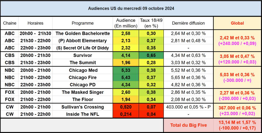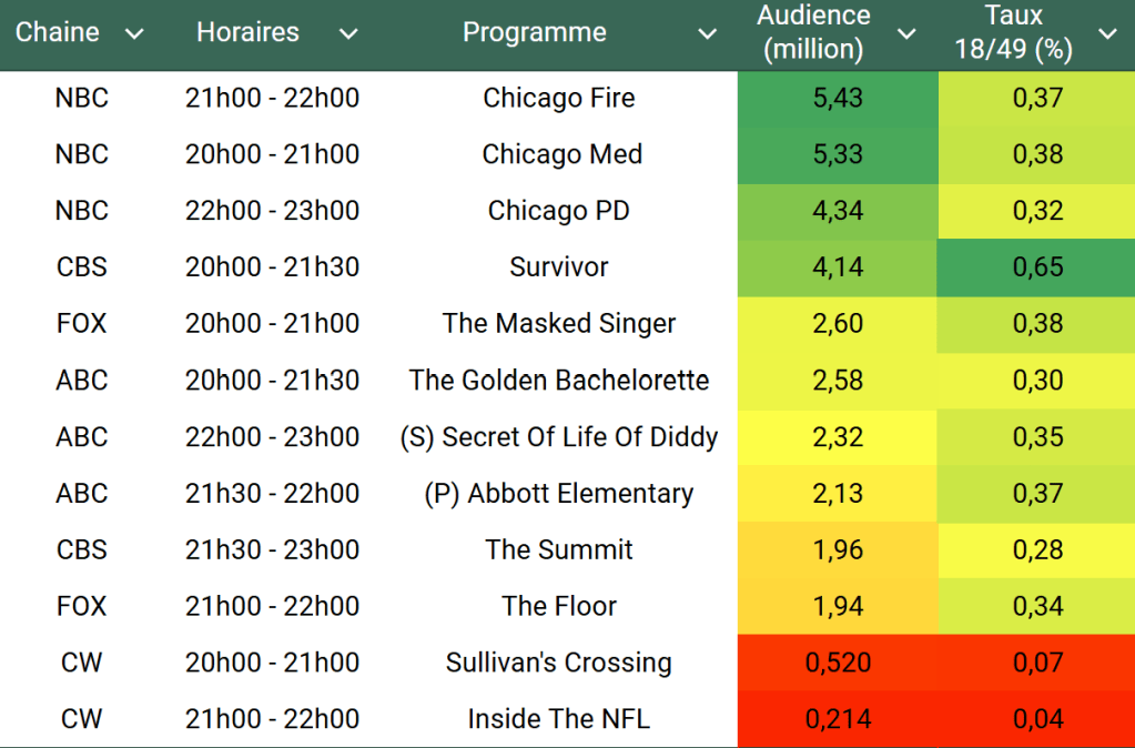 Audiences US du Mercredi 09.10.24 : Le One Chicago large leader. Abbott Elementary revient en baisse mais s’en sort sur cible. The Summit n’arrive pas à convaincre sur CBS. The Masked Singer en petite forme.