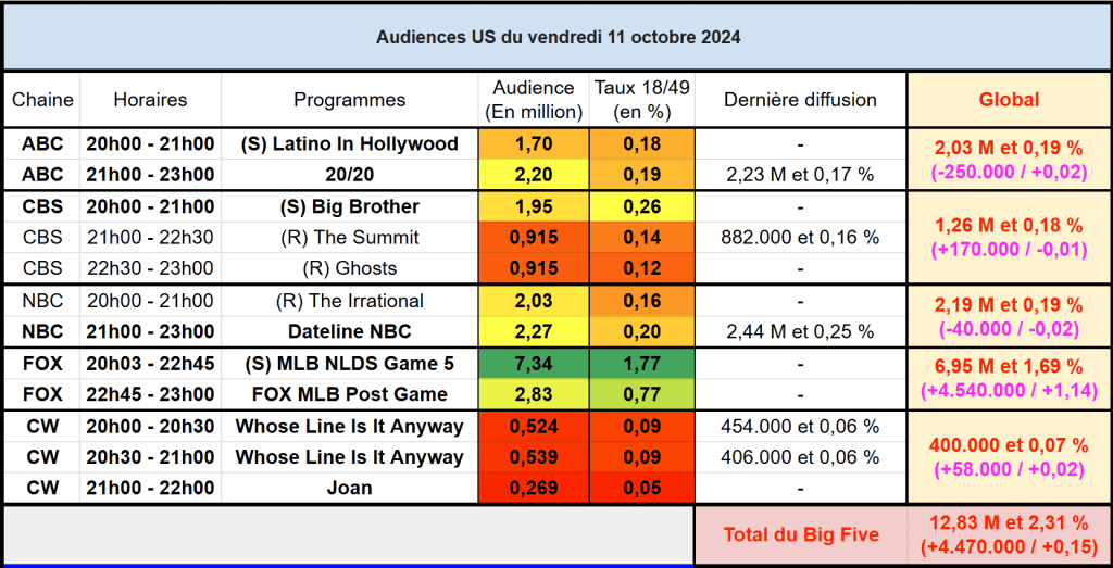Audiences US du Vendredi 11.10.24 : Succès pour FOX qui dépasse les 7 millions avec le baseball. CBS en souffrance. Dateline en baisse. Thomas Fusil Communiqués Audiences US 16 octobre 2024 1 Minute Voici les audiences de la soirée du 11 Octobre Audiences triées (téléspectateurs) Partager : Partager sur X(ouvre dans une nouvelle fenêtre) X Partager sur Facebook(ouvre dans une nouvelle fenêtre) Facebook J’aime chargement… Similaire Publié par Thomas Fusil Voir tous les articles par Thomas Fusil Publié 16 octobre 2024