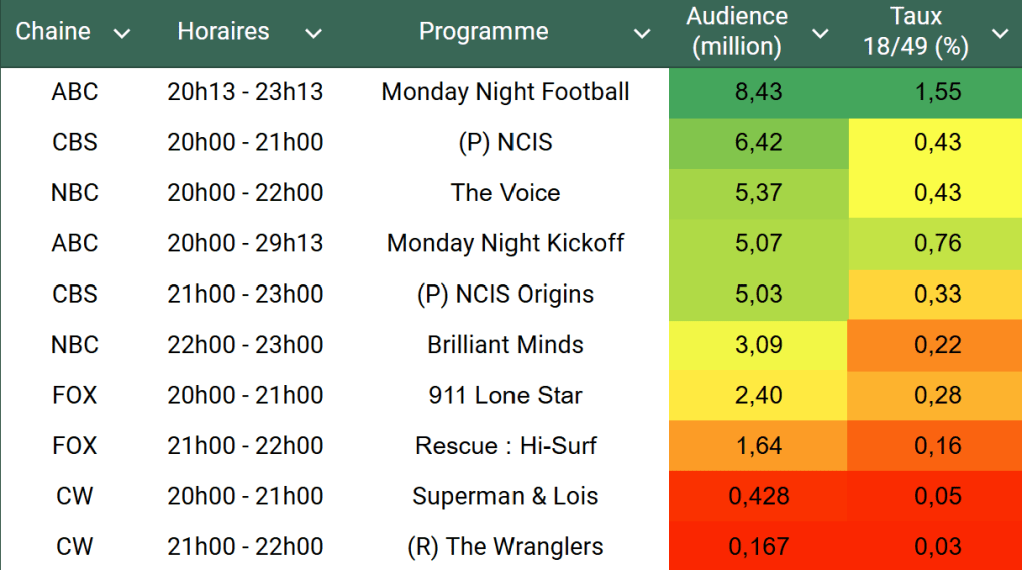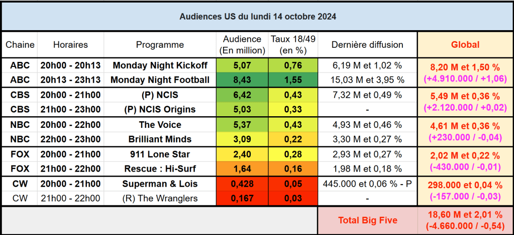 Audiences US du Lundi 14.10.24 : ABC leader avec la NFL. Très bonne soirée pour CBS avec NCIS (malgré une forte baisse) et NCIS Origins. 911 Lone Star et Rescue Hi-Surf souffrent.
