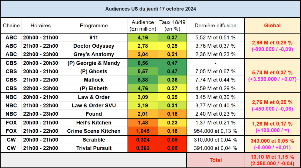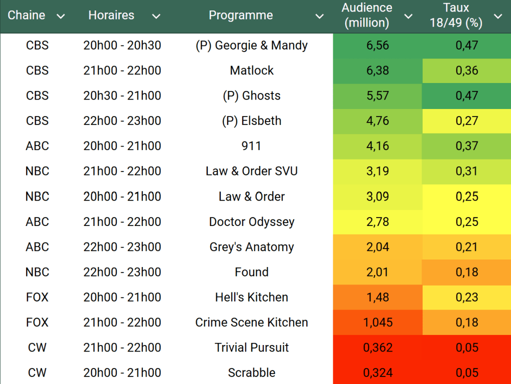 Audiences US du Jeudi 17.10.24 : Carton pour la soirée de CBS avec Georgie & Mandy, Ghosts, Matlock et Elsbeth. ABC et NBC souffrent de cette nouvelle concurrence et enregistrent de fortes baisses.