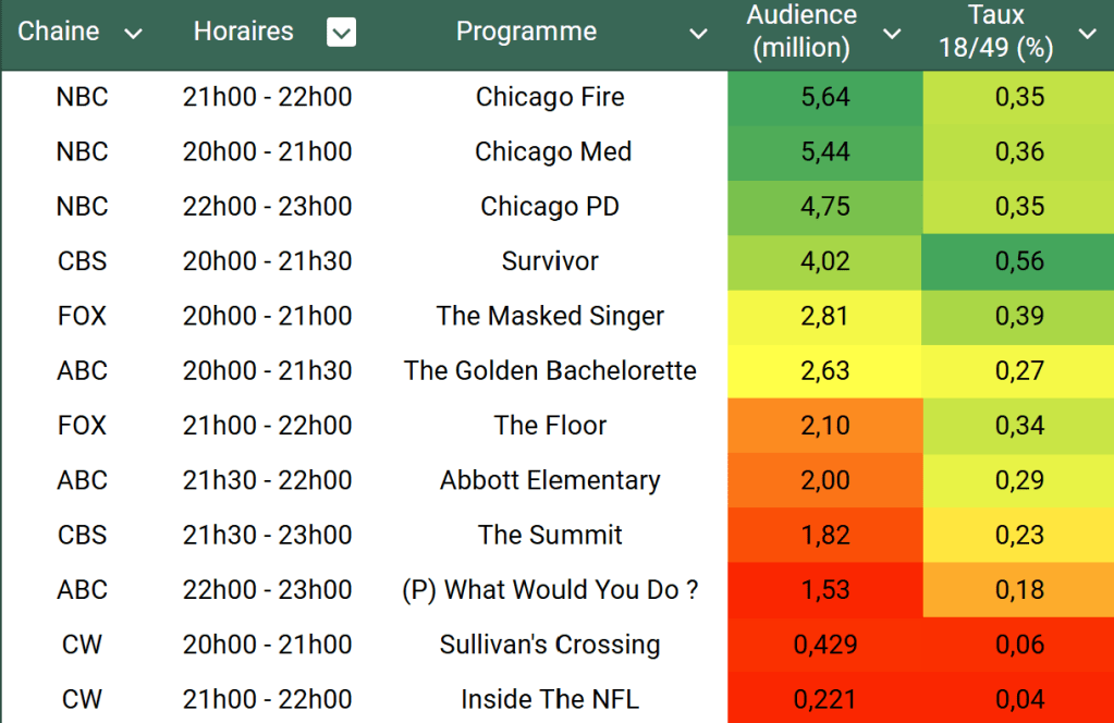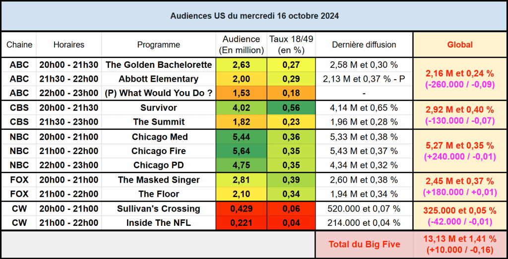 Audiences US du Mercredi 16.10.24 : Le One Chicago solide leader en hausse. The Summit continue de baisser. Abbott Elementary perd des fidèles. La soirée de FOX remonte. Thomas Fusil Communiqués Audiences US 21 octobre 2024 1 Minute Voici les audiences de la soirée du 16 Octobre Audiences triées (téléspectateurs) Partager : Partager sur X(ouvre dans une nouvelle fenêtre) X Partager sur Facebook(ouvre dans une nouvelle fenêtre) Facebook J’aime chargement… Similaire Publié par Thomas Fusil Voir tous les articles par Thomas Fusil Publié 21 octobre 2024