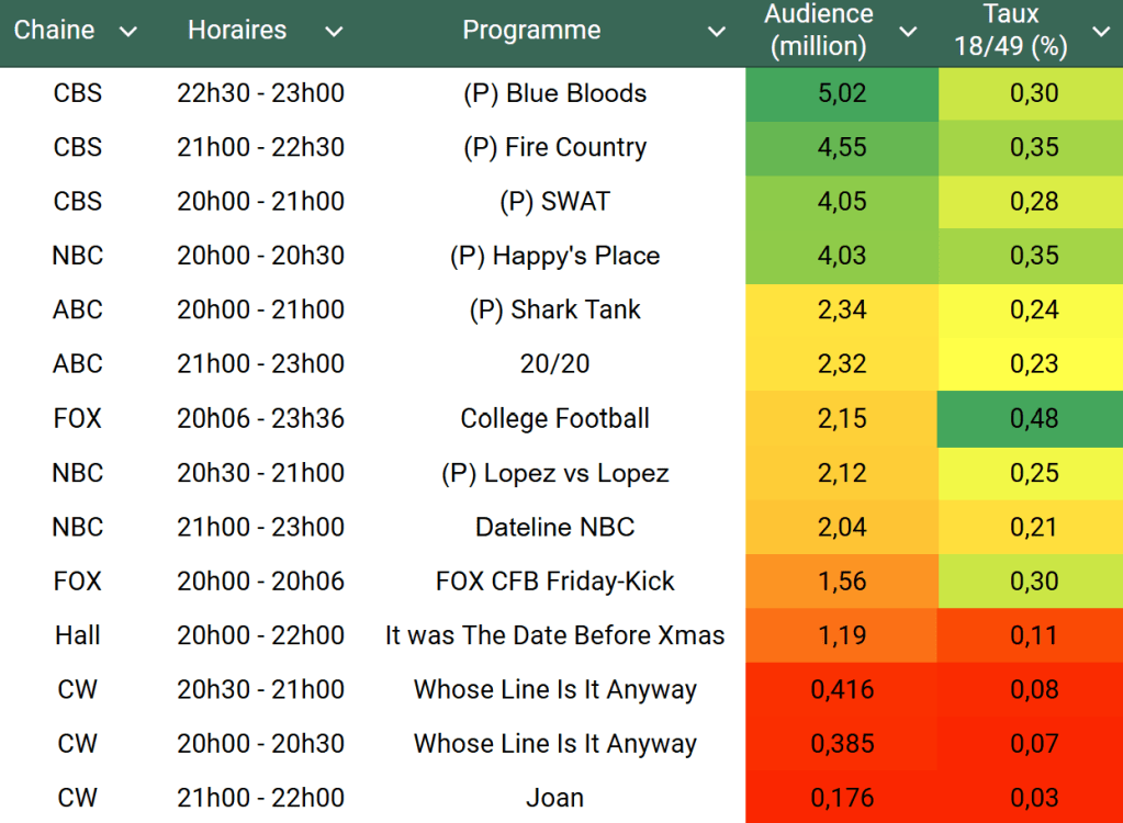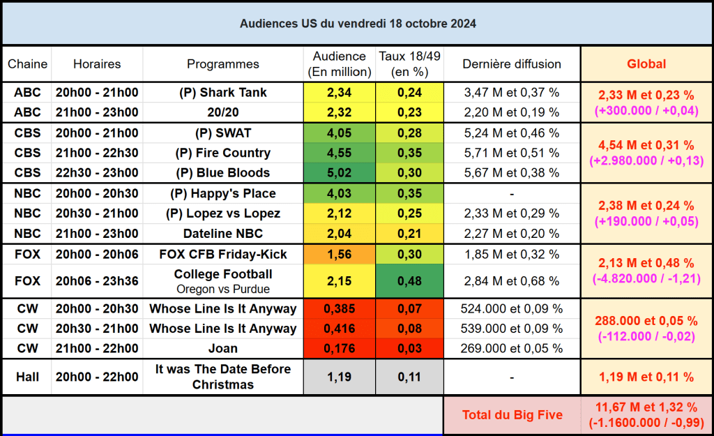 Audiences US du Vendredi 18.10.24 : Le retour de SWAT, Fire Country et Blue Bloods permet à CBS de dominer malgré une forte baisse. Succès pour Happy’s Place sur NBC. Retour raté pour Shark Tank.