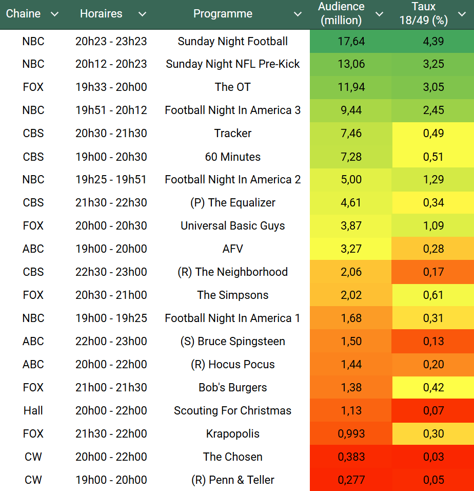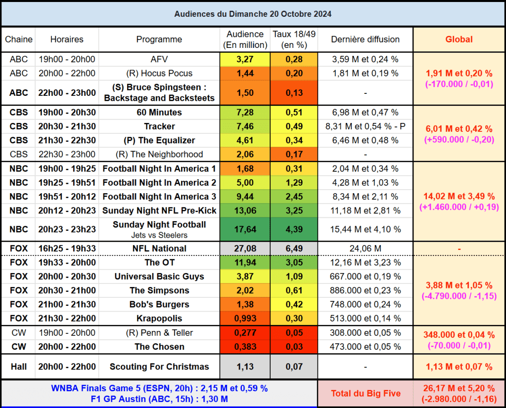 Audiences US du Dimanche 20.10.24 : SNF leader en hausse. Le bloc animation de FOX boosté par la NFL. Tracker reste puissant malgré une baisse. Retour en très forte baisse pour The Equalizer.