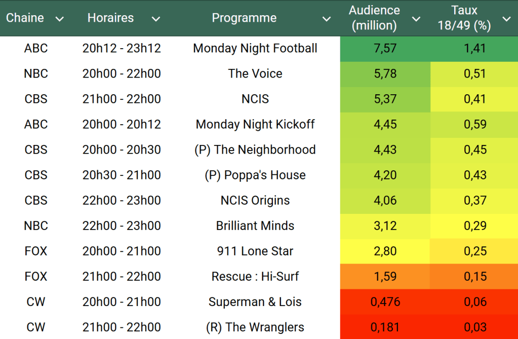 Audiences US du Lundi 21.10.24 : MNF leader mais une nouvelle fois en baisse. NCIS et NCIS Origins perdent beaucoup en deuxième semaine. The Voice en forme avec le début des blattles.