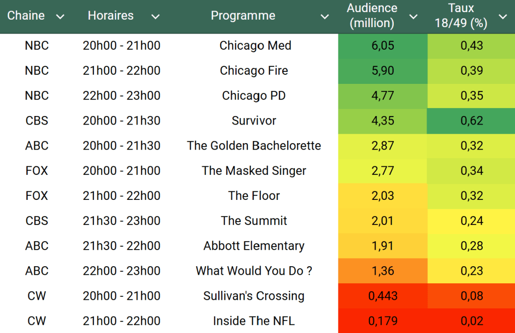 Audiences US du Mercredi 23.10.24 : Excellent score pour Chicago Med qui dépasse les 6 millions. Chicago Fire et The Golden Bachelorette également au plus haut. Abbott Elementary en baisse.