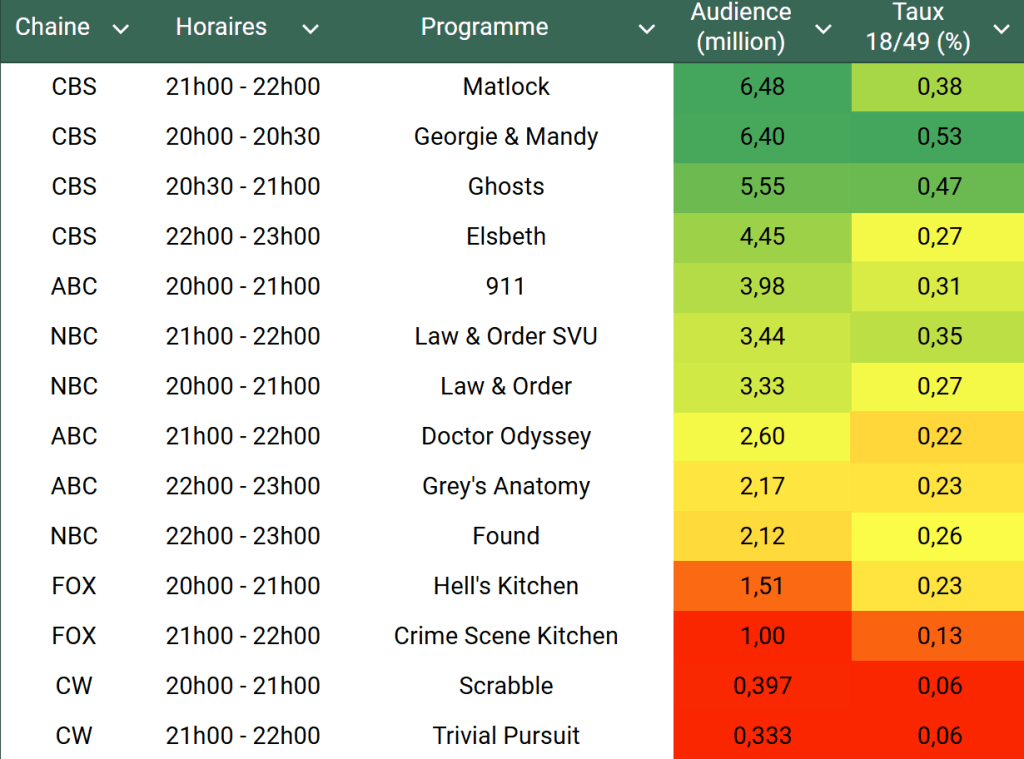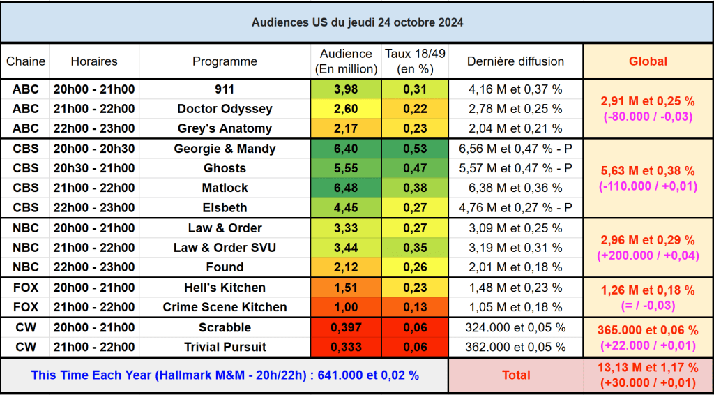 Audiences US du Jeudi 24.10.24 : Matlock, en progression, signe un excellent score sur CBS. Georgie et Mandy confirme son succès. La soirée série de NBC en hausse contrairement à celle de ABC.