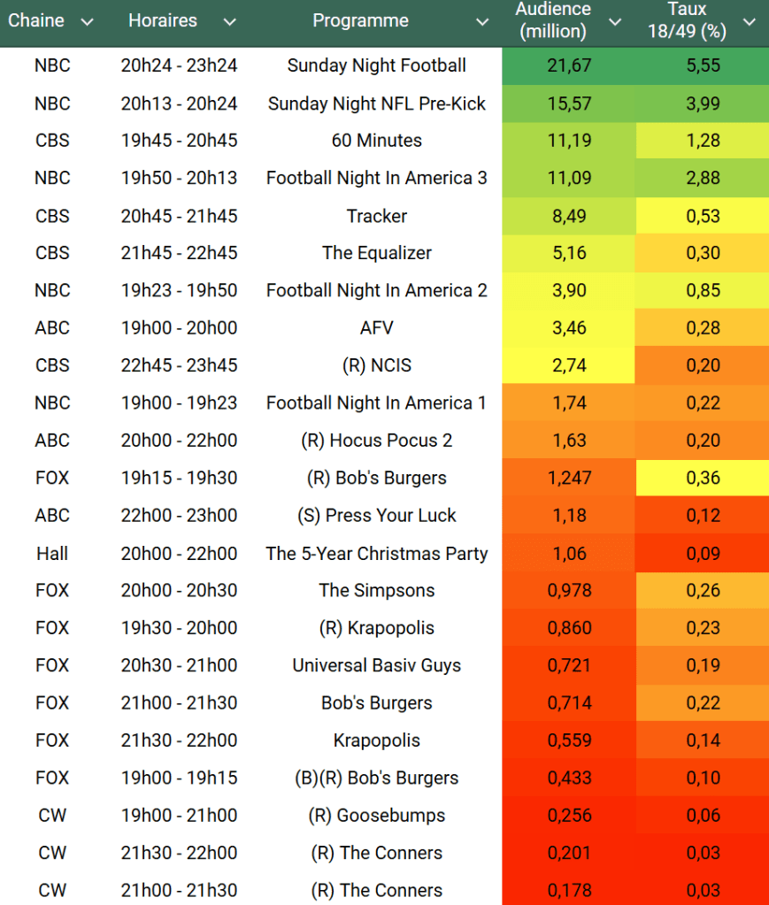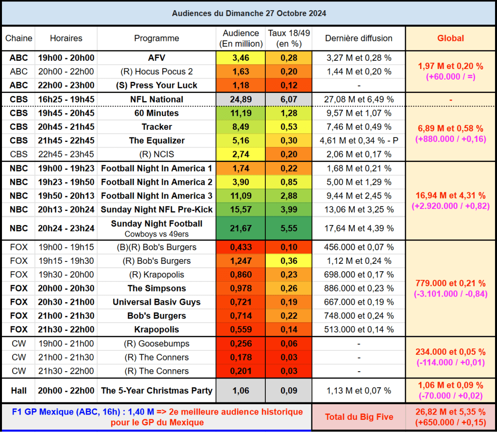 Audiences US du Dimanche 27.10.24 : Carton pour SNF, en très grande forme ce dimanche. Succès pour 60 Minutes et Tracker. Flop pour Press Your Luck spécial Halloween. Thomas Fusil Communiqués Audiences US 30 octobre 2024 1 Minute Voici les audiences de la soirée du 27 Octobre Audiences triées (téléspectateurs) Partager : Partager sur X(ouvre dans une nouvelle fenêtre) X Partager sur Facebook(ouvre dans une nouvelle fenêtre) Facebook J’aime chargement… Similaire Publié par Thomas Fusil Voir tous les articles par Thomas Fusil Publié 30 octobre 2024