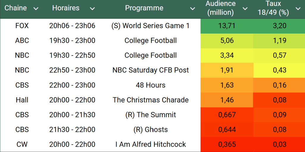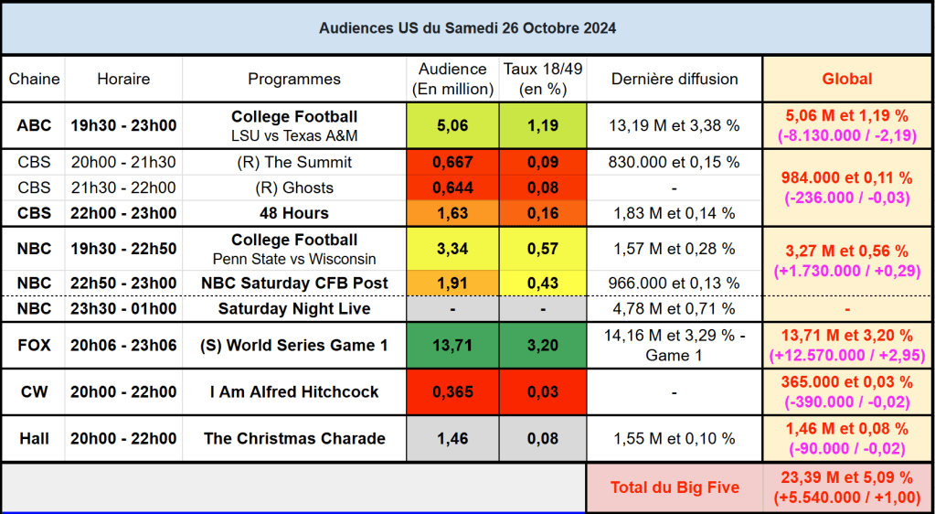 Audiences US du Samedi 26.10.24 : Le deuxième match des World Series très largement en tête. College Football solide sur ABC et NBC. Soirée très difficile pour CBS, sous le million.