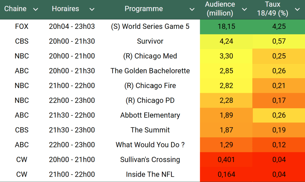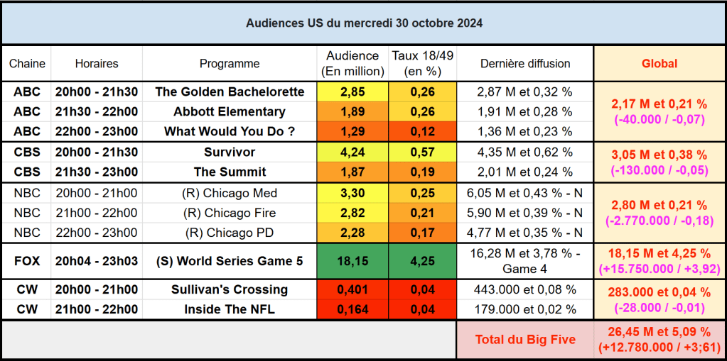 Audiences US du Mercredi 30.10.24 : Le 5e et dernier match des World Series explose tout sur FOX. What Would You Do très faible sur ABC. Le One Chicago solide en rediffusion.