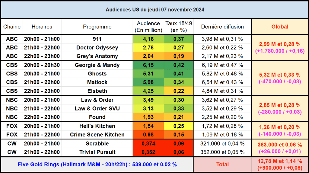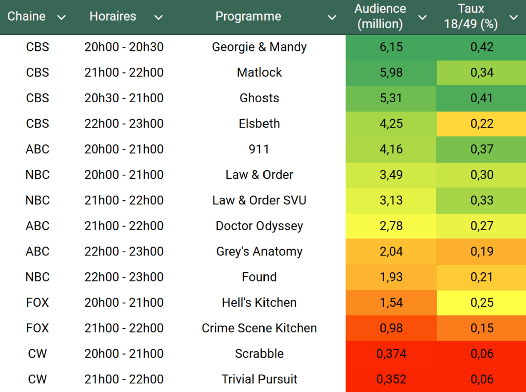 Audiences US du Jeudi 07.11.24 : Georgie & Mandy bon leader, stable sur CBS. Ghosts, Matlock et Elsbeth en forte baisse. 911 remonte. Found passe sous les 2 millions. Thomas Fusil Communiqués Audiences US 9 novembre 2024 1 Minute Voici les audiences de la soirée du 7 Novembre Audiences triées (téléspectateurs) Partager : Partager sur X(ouvre dans une nouvelle fenêtre) X Partager sur Facebook(ouvre dans une nouvelle fenêtre) Facebook J’aime chargement… Similaire Publié par Thomas Fusil Voir tous les articles par Thomas Fusil Publié 9 novembre 2024