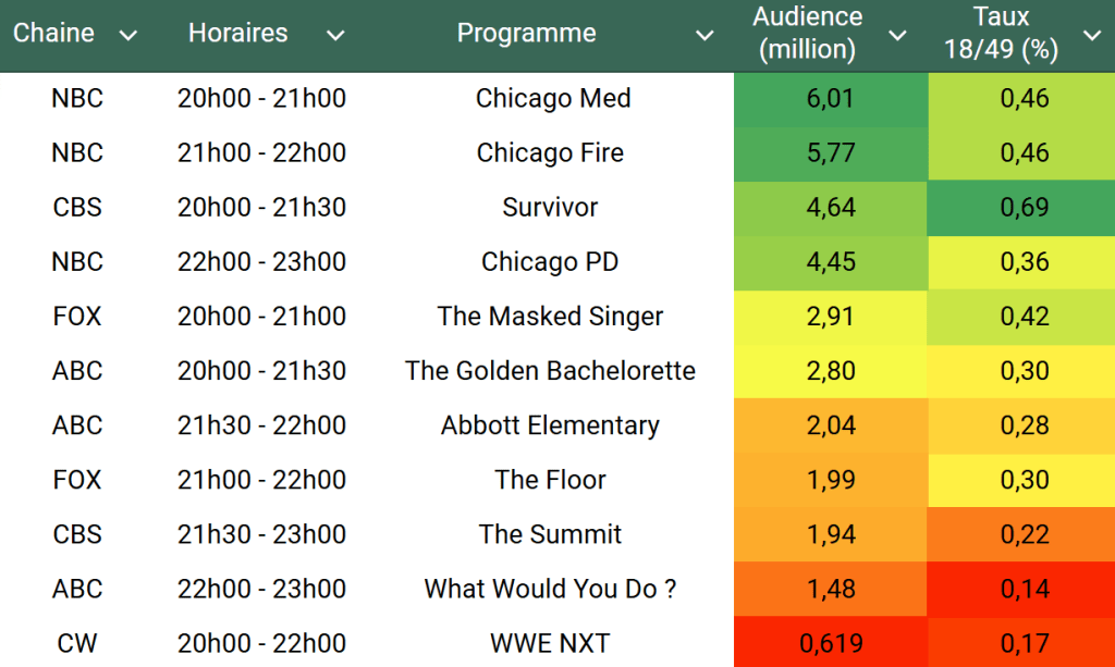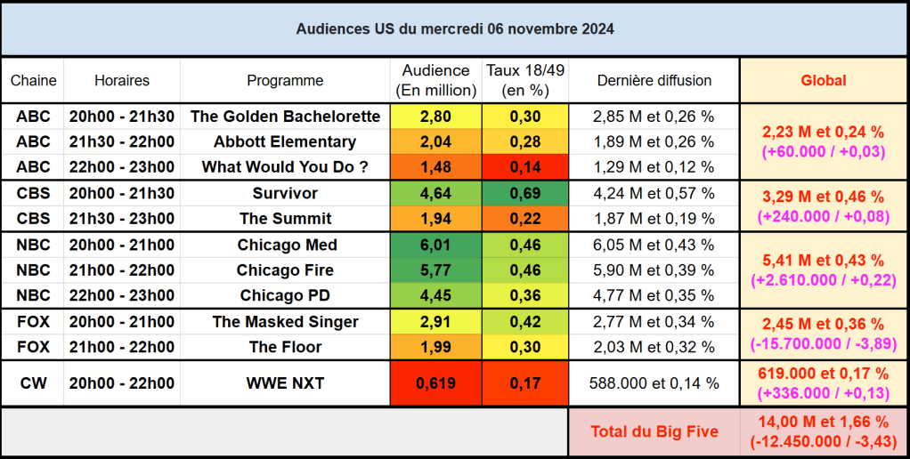 Audiences US du Mercredi 06.11.24 : Chicago Med au top, atteint 6 millions pour le deuxième épisode consécutif. Survivor, The Masked Singer, Abbott Elementary en hausse. Thomas Fusil Communiqués Audiences US 9 novembre 2024 1 Minute Voici les audiences de la soirée du 6 Novembre Audiences triées (téléspectateurs) Partager : Partager sur X(ouvre dans une nouvelle fenêtre) X Partager sur Facebook(ouvre dans une nouvelle fenêtre) Facebook J’aime chargement… Similaire Publié par Thomas Fusil Voir tous les articles par Thomas Fusil Publié 9 novembre 2024
