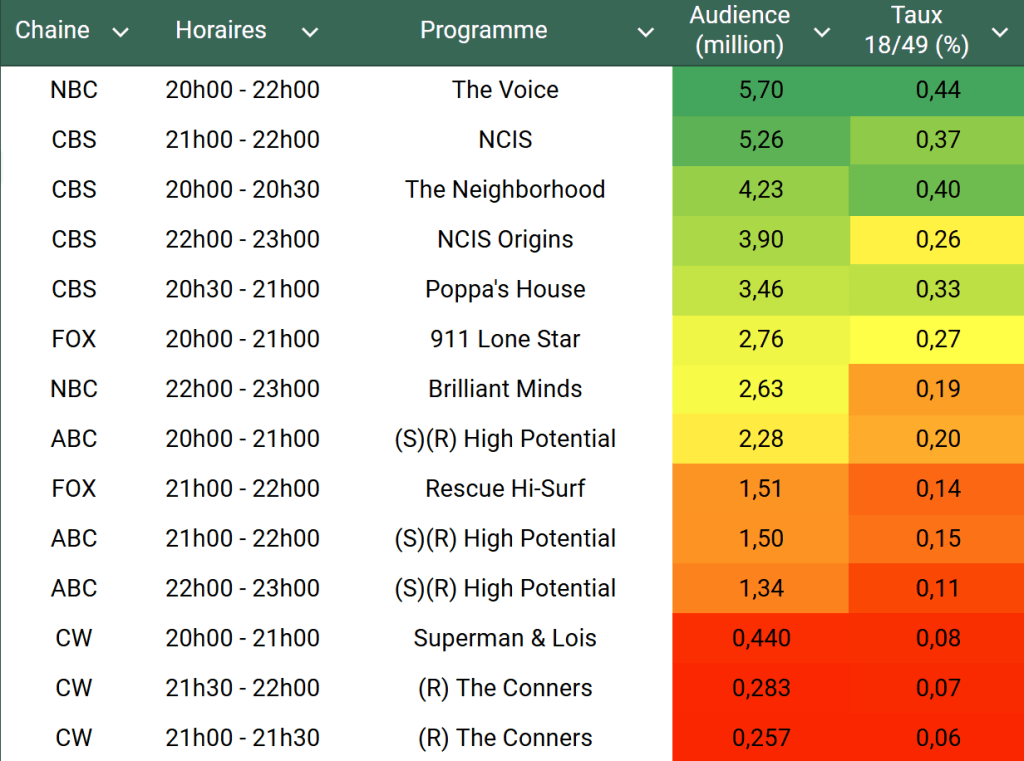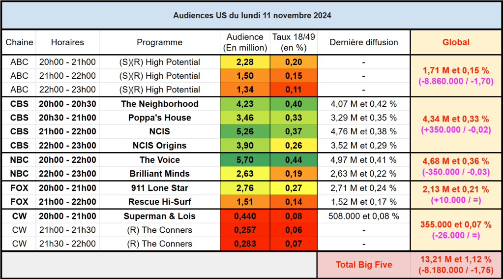 Audiences US du Lundi 11.11.24 : The Voice leader en forte hausse sur NBC. NCIS et NCIS Origins remontent en téléspectateurs. Catastrophe sur cible pour Rescue Hi-Surf. Thomas Fusil Communiqués Audiences US 16 novembre 2024 1 Minute Voici les audiences de la soirée du 11 Novembre Audiences triées (téléspectateurs) Partager : Partager sur X(ouvre dans une nouvelle fenêtre) X Partager sur Facebook(ouvre dans une nouvelle fenêtre) Facebook J’aime chargement… Similaire Publié par Thomas Fusil Voir tous les articles par Thomas Fusil Publié 16 novembre 2024