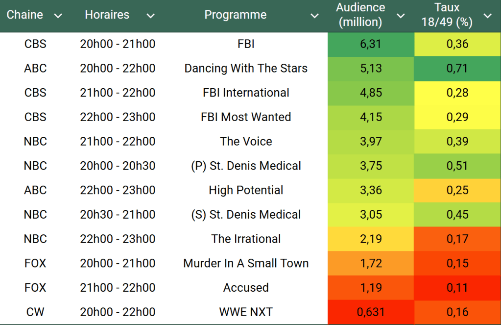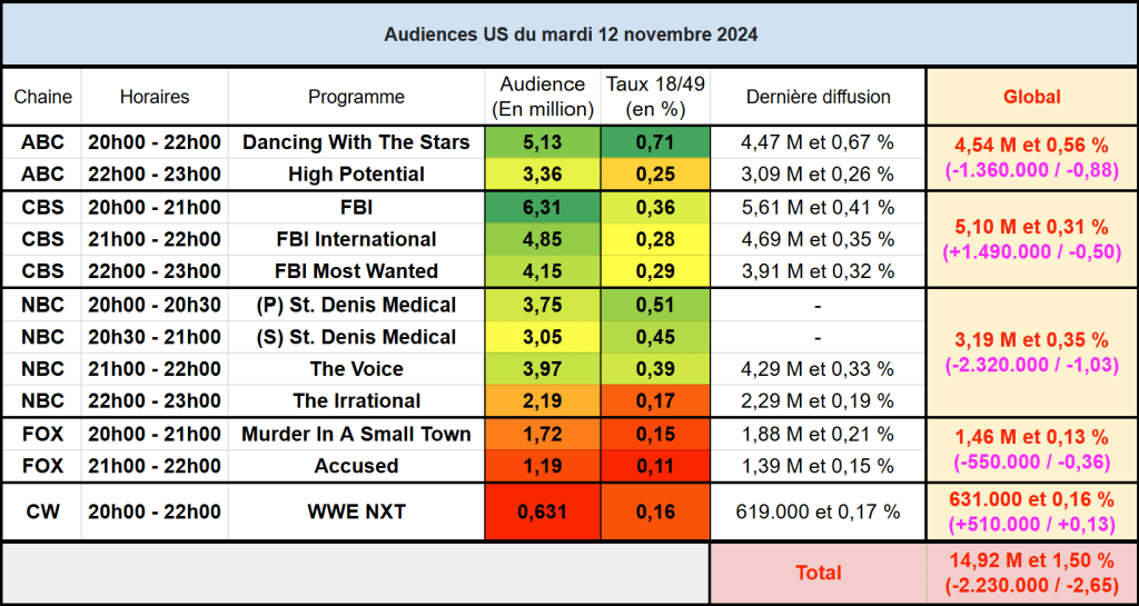 Audiences US du Mardi 12.11.24 : FBI leader en forte hausse à plus de 6 millions. Succès pour DWTS, très fort sur cible. St. Denis Medical démarre très bien sur NBC. The Irrational en difficulté.
