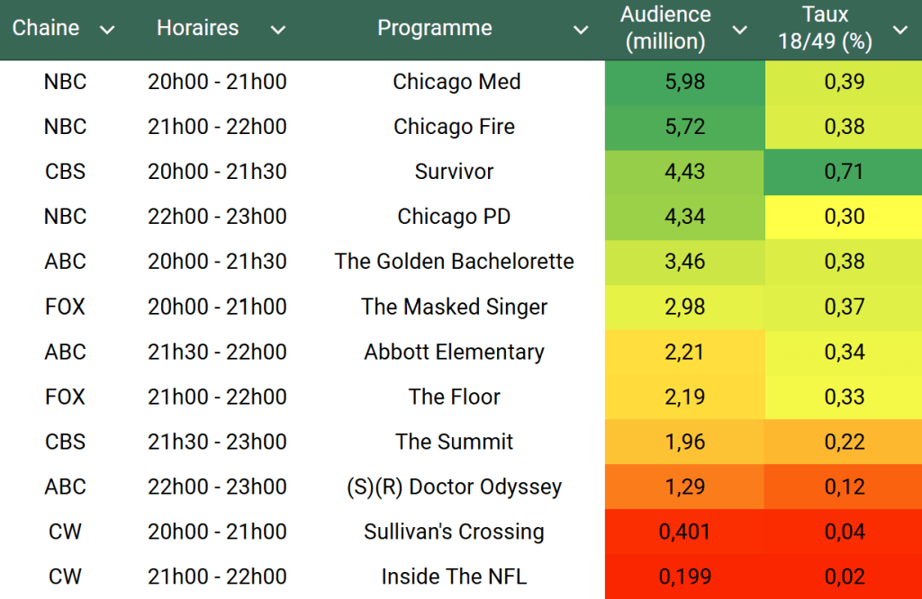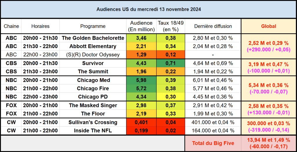 Audiences US du Mercredi 13.11.24 : Chicago Med toujours leader devant Chicago Fire. Survivor puissant sur cible. The Golden Bachelorette au plus haut pour son final sur ABC.