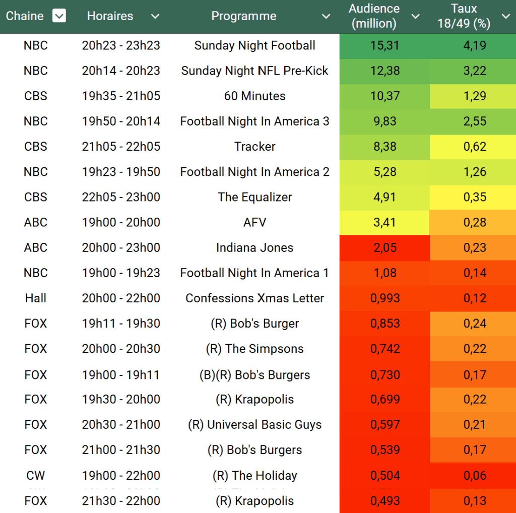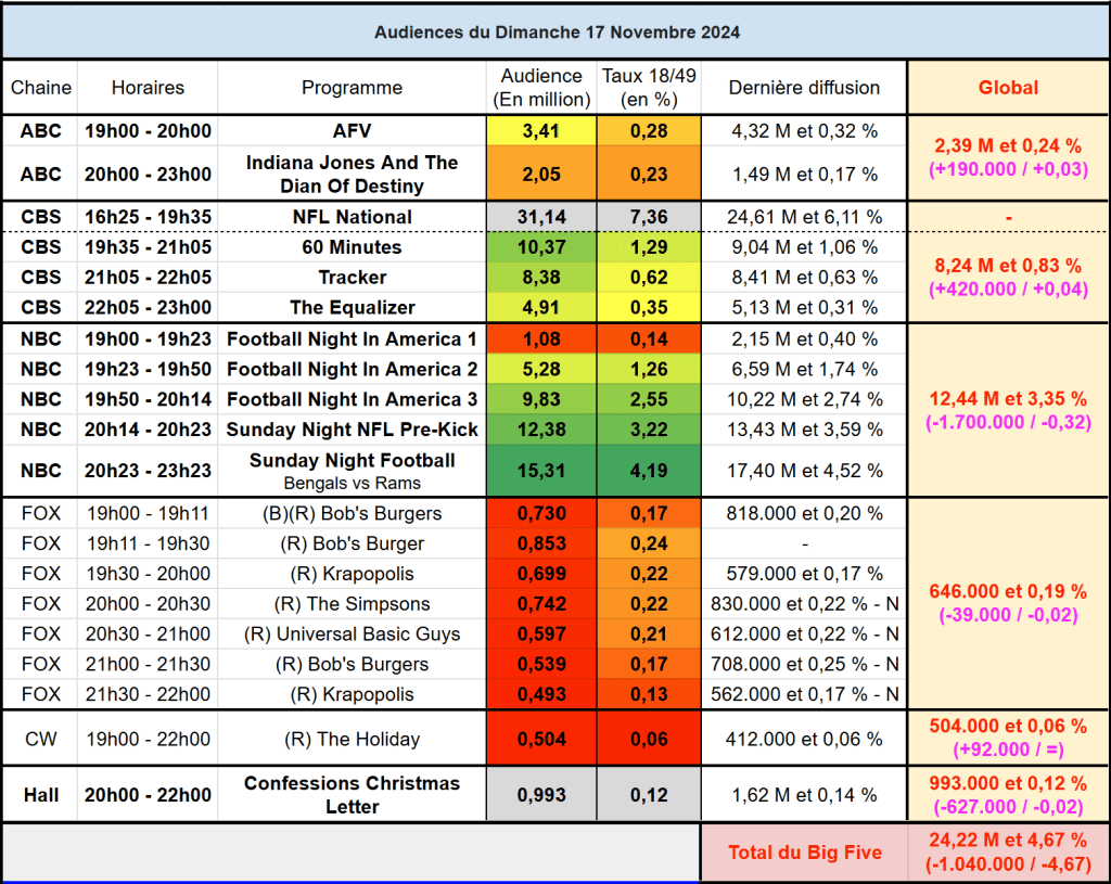Audiences US du Dimanche 17.11.24 : Enorme score pour la NFL sur CBS en fin d’après midi, qui signe un record depuis 17 ans. 60 Minutes et Tracker au top en prime. The Equalizer sous les 5 millions.