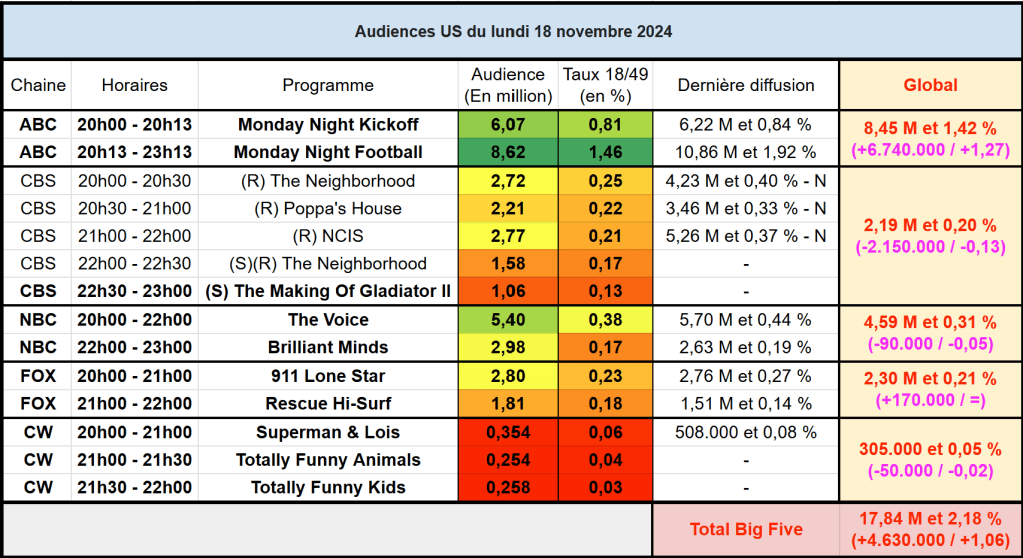 Audiences US du Lundi 18.11.24 : Monday Night Football large leader en baisse. Brilliant Minds, 911 Lone Star et Rescue Hi-Surf progressent mais sont faibles sur cible. Thomas Fusil Communiqués Audiences US 22 novembre 2024 1 Minute Voici les audiences de la soirée du 18 Novembre Audiences triées (téléspectateurs) Partager : Partager sur X(ouvre dans une nouvelle fenêtre) X Partager sur Facebook(ouvre dans une nouvelle fenêtre) Facebook J’aime chargement… Similaire Publié par Thomas Fusil Voir tous les articles par Thomas Fusil Publié 22 novembre 2024