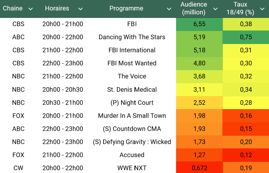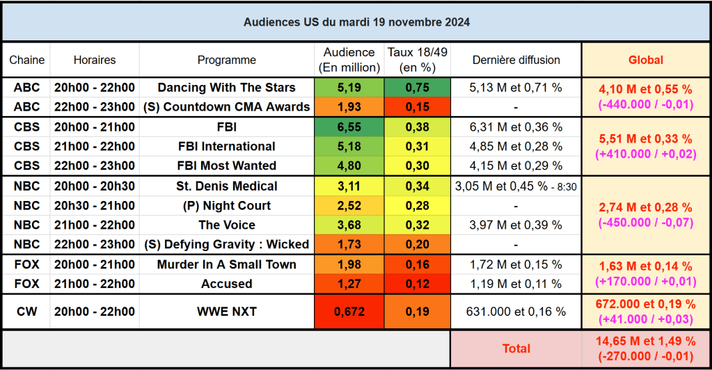Audiences US du Mardi 19.11.24 : Record de saison pour FBI, FBI International, FBI Most Wanted. Dancing With The Stars, aussi au plus haut, très puissant sur cible. NBC n’est pas en grande forme.