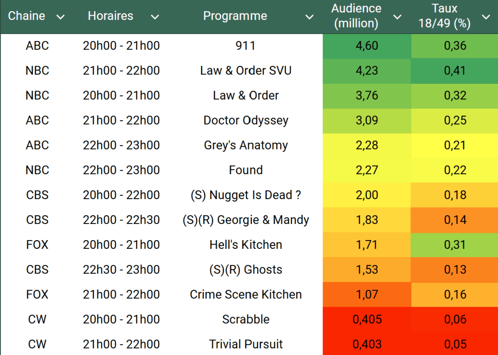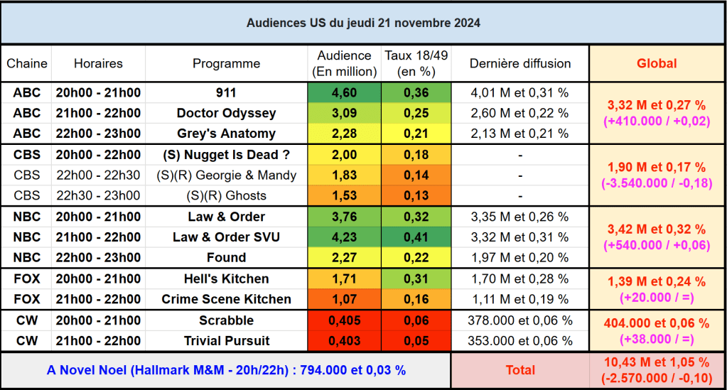 Audiences US du Jeudi 21.11.24 : 911 leader en hausse. Law & Order SVU bondit sans CBS, et signe son record de saison, tout comme Law & Order. CBS sous les 2 millions. Thomas Fusil Communiqués Audiences US 27 novembre 2024 1 Minute Voici les audiences de la soirée du 21 Novembre Audiences triées (téléspectateurs) Partager : Partager sur X(ouvre dans une nouvelle fenêtre) X Partager sur Facebook(ouvre dans une nouvelle fenêtre) Facebook J’aime chargement… Similaire Publié par Thomas Fusil Voir tous les articles par Thomas Fusil Publié 27 novembre 2024