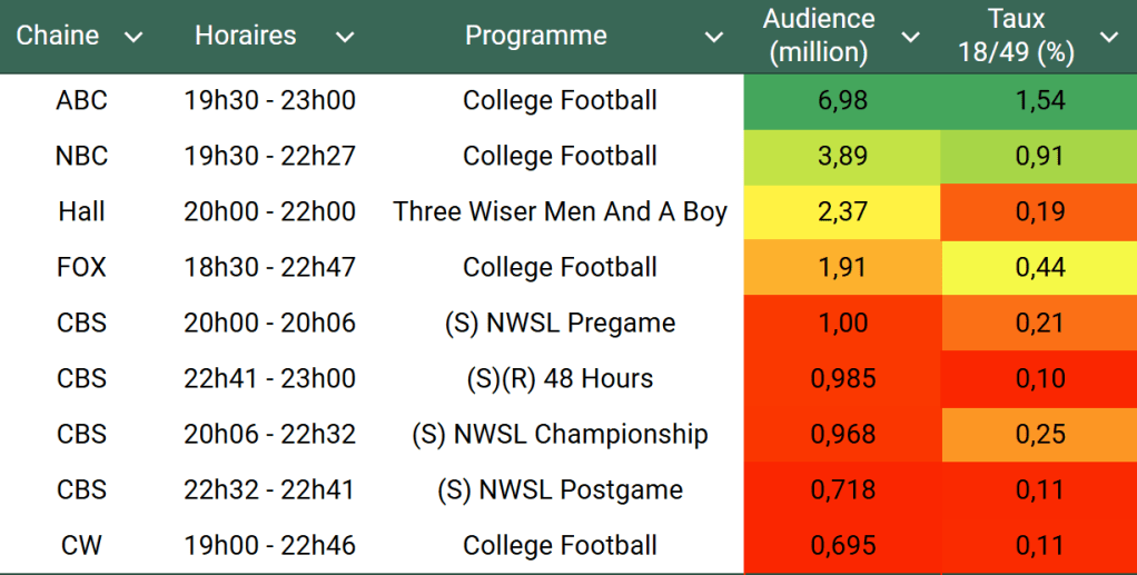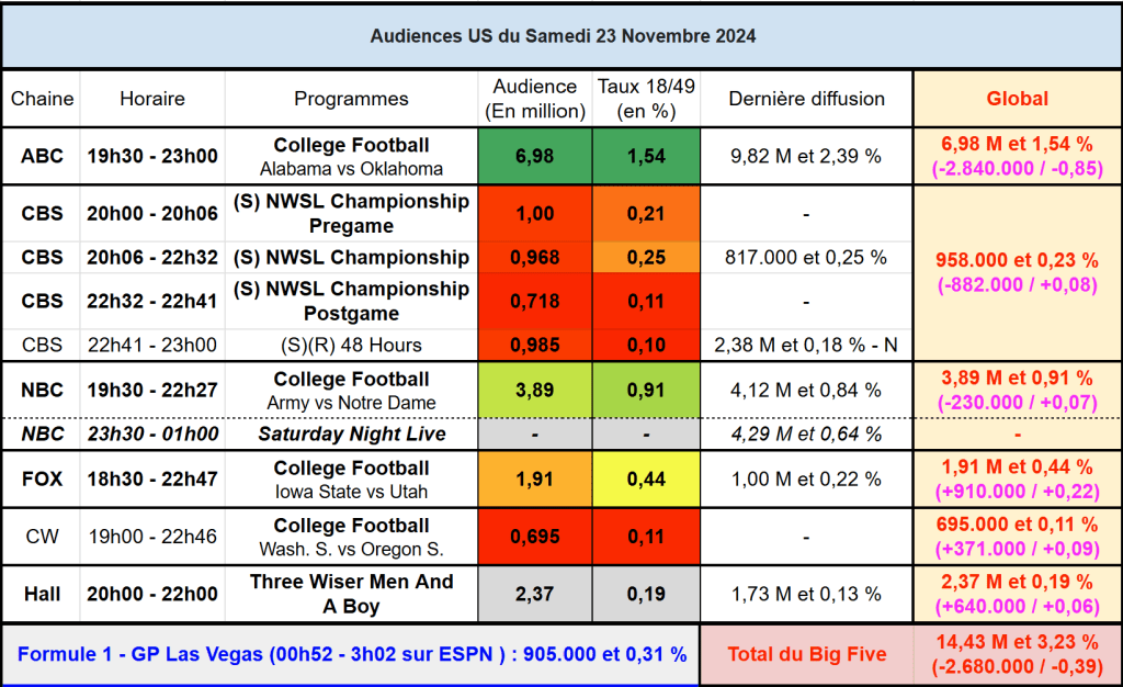 Audiences US du Samedi 23.11.24 : ABC très large leader avec College Football. Hallmark au plus haut depuis novembre 2023. NWSL en légère hausse sur CBS par rapport à 2023.