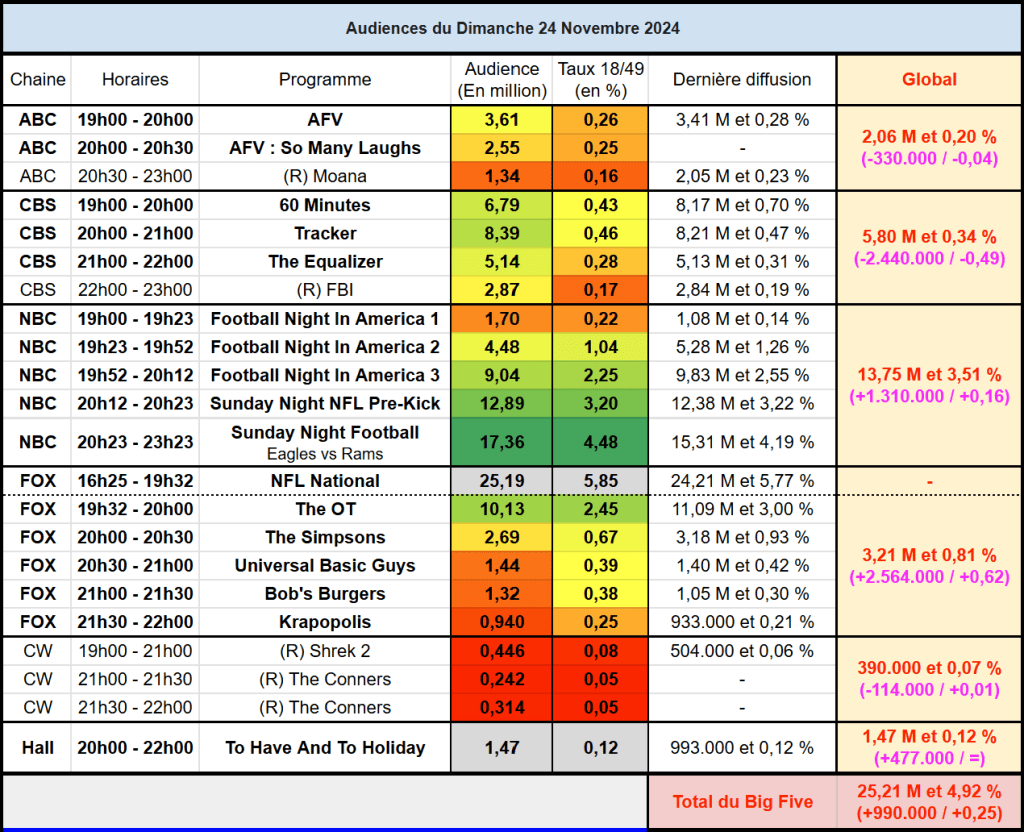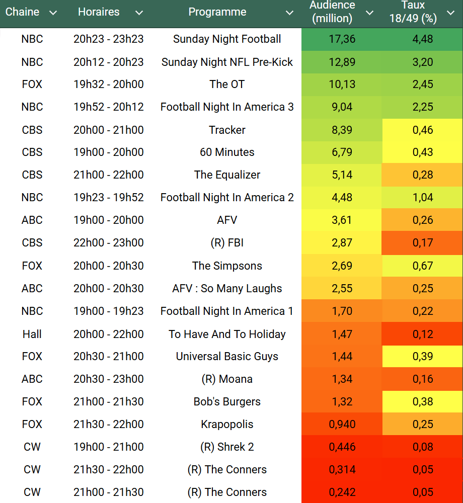 Audiences US du Dimanche 24.11.24 : SNF leader en hausse. Tracker toujours au top sur CBS. The Simpsons en baisse en post NFL. Hallmark progresse fortement avec son téléfilm.