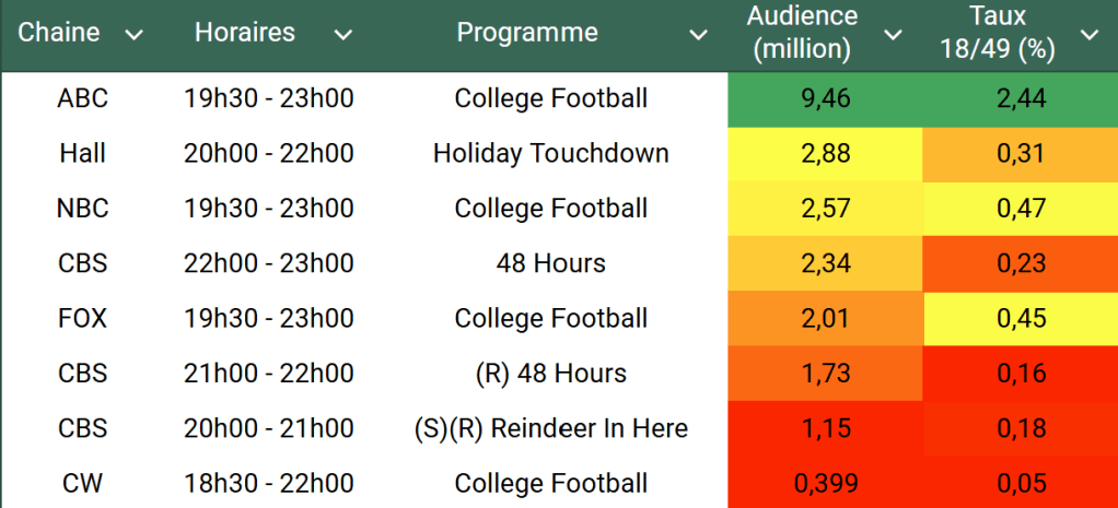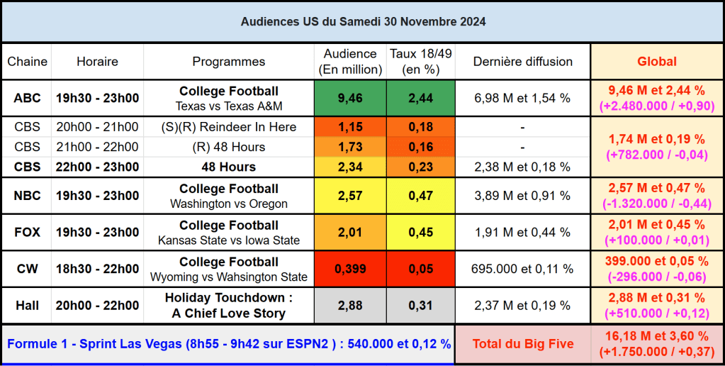 Audiences US du Samedi 30.11.24 : ABC distance largement la concurrence et dépasse les 9 millions avec College Football. Record depuis Novembre 2023 pour Hallmark qui est devant NBC, CBS et FOX.