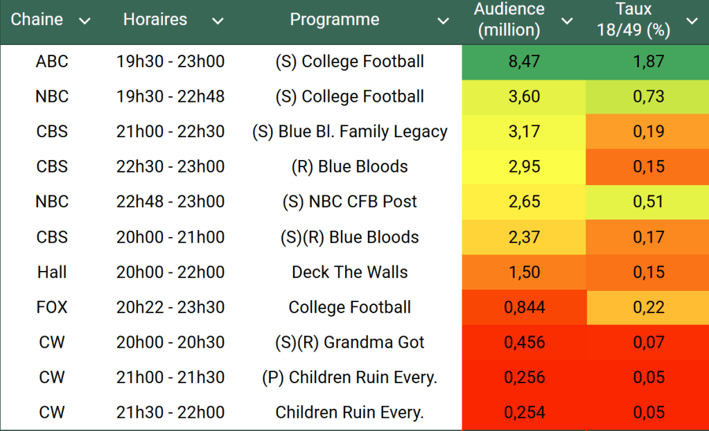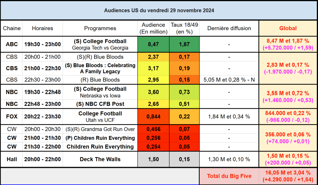 Audiences US du Vendredi 29.11.24 : Succès pour College Football sur ABC qui dépasse les 8 millions. Bon score pour l’émission hommage à Blue Bloods. Hallmark en hausse. FOX faible.