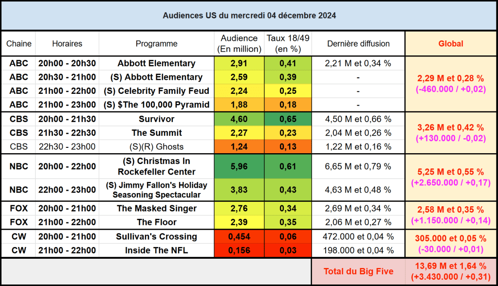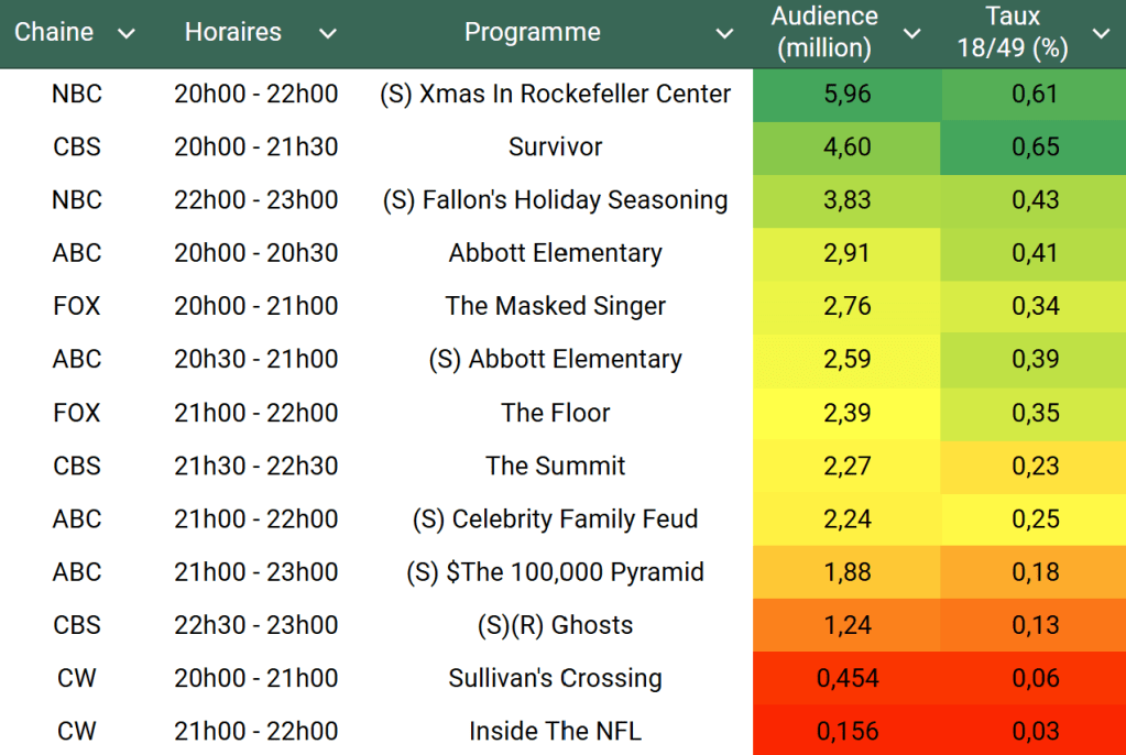 Audiences US du Mercredi 04.12.24 : Succès pour NBC et Christmas In Rockefeller Center malgré une baisse. Record depuis Février 2023 pour Abbott Elementary. The Floor en grande forme.