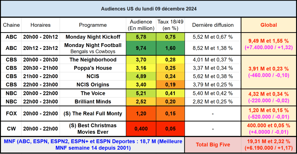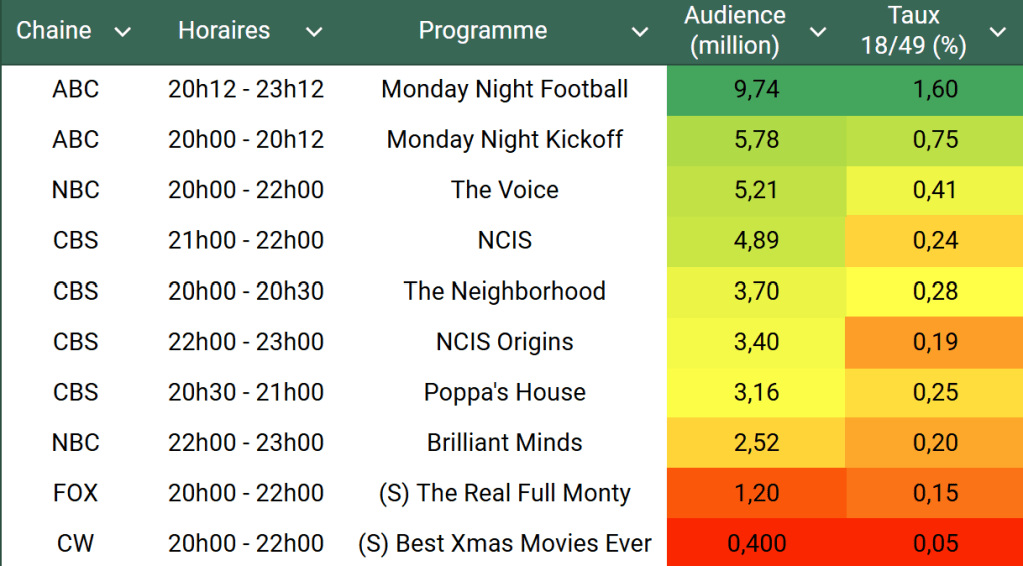 Audiences US du Lundi 09.12.24 : MNF ne laisse aucune chance à la concurrence. The Neighborhood, Poppa’s House, NCIS Origins et Brilliant Minds au plus bas. The Voice et NCIS en petite forme.