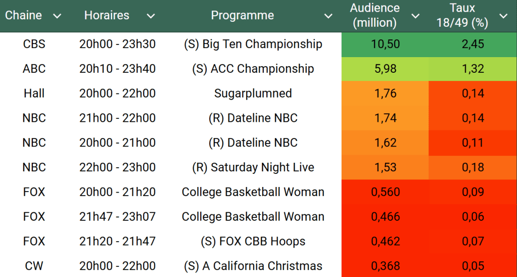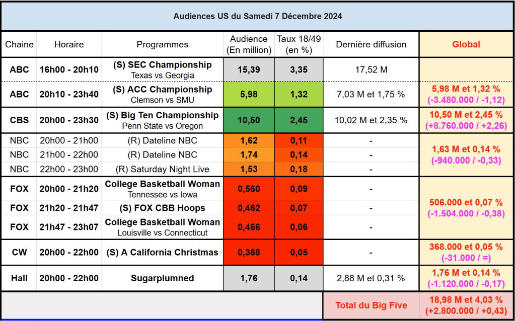 Audiences US du Samedi 07.12.24 : Carton pour Big Ten Championship sur CBS qui dépasse les 10 millions. ABC solide également. FOX très faible avec le basket féminin. Hallmark en forte baisse.