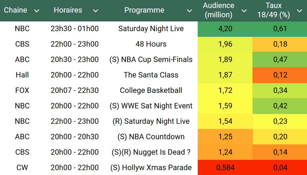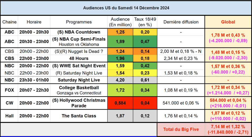 Audiences US du Samedi 14.12.24 : Diffusé à 23h30, SNL fait plus du double d’audience que le meilleur programme en prime, tous sous les 2 millions. Hallmark leader de la soirée. La NBA et WWE performent sur cible.