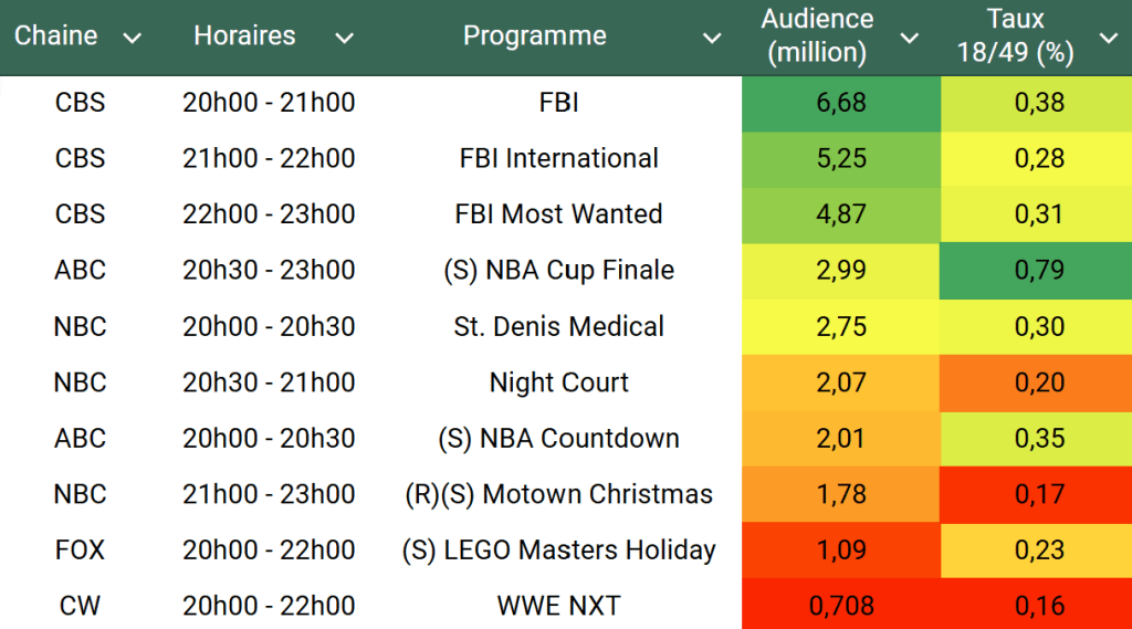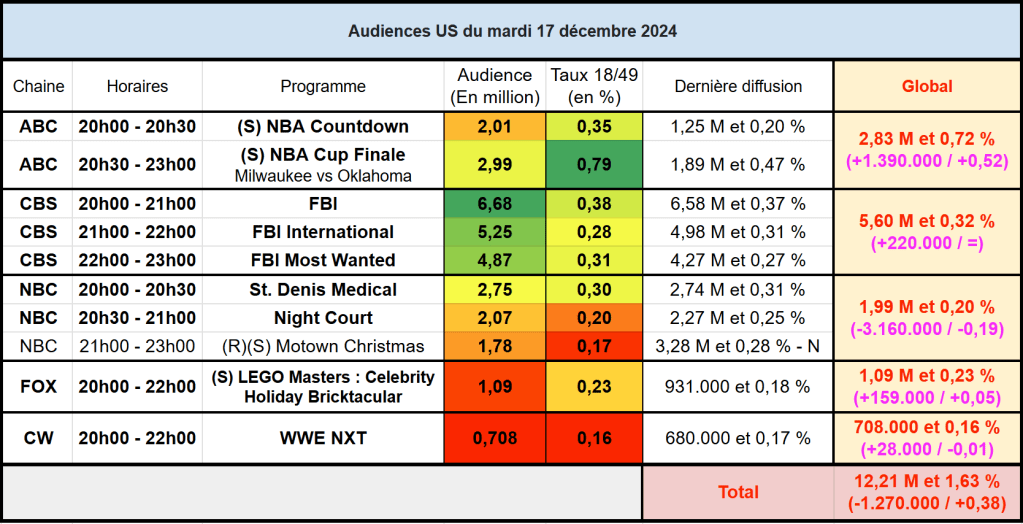 Audiences US du Mardi 17.12.24 : FBI, FBI International et FBI Most Wanted au plus haut sur CBS. Bon score sur cible pour la NBA. Night Court au plus bas. Thomas Fusil Communiqués Audiences US 21 décembre 2024 1 Minute Voici les audiences de la soirée du 17 Décembre Audiences triées (téléspectateurs) Partager : Partager sur X(ouvre dans une nouvelle fenêtre) X Partager sur Facebook(ouvre dans une nouvelle fenêtre) Facebook J’aime chargement… Similaire Publié par Thomas Fusil Voir tous les articles par Thomas Fusil Publié 21 décembre 2024