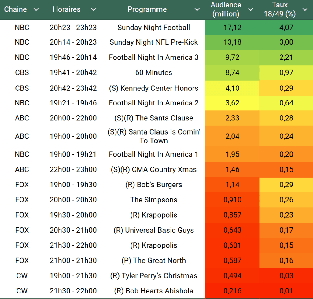 Audiences US du Dimanche 22.12.24 : SNF très large leader sur NBC. 60 Minutes signe la meilleure audience non sportive de la soirée. The Kennedy Center Honors en baisse sur un an. FOX nettement sous le million.