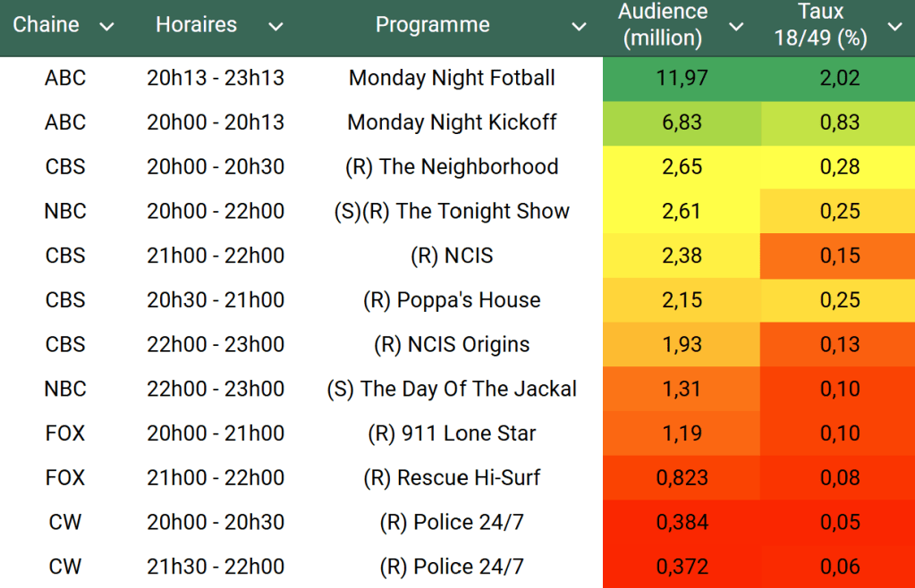Voici les audiences triées (téléspectateurs)
